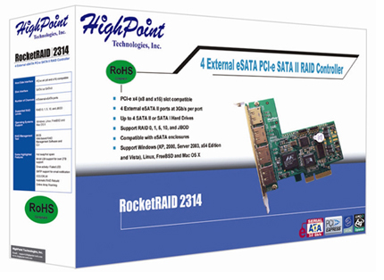 The HighPoint RocketRAID 2314 PCI Express to SATA II RAID Controller is the next generation for high performance computing solutions utilizing the latest interconnect technology PCI-Express. The RocketRAID 2314 is set to give much faster and improved I/O and supports features that are critical for high performance computing and high end workstations. With Port Multiplier (PM) support the RocketRAID 2314 can support up to 20 devices with PM enclosures.