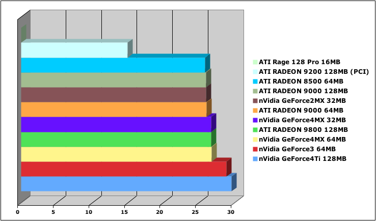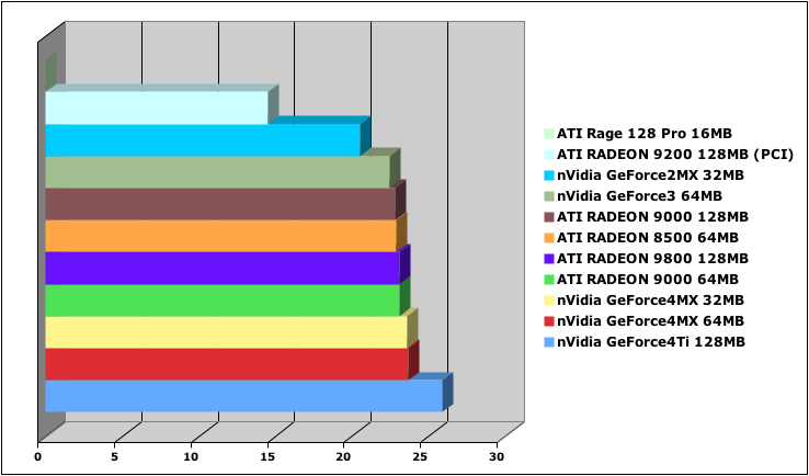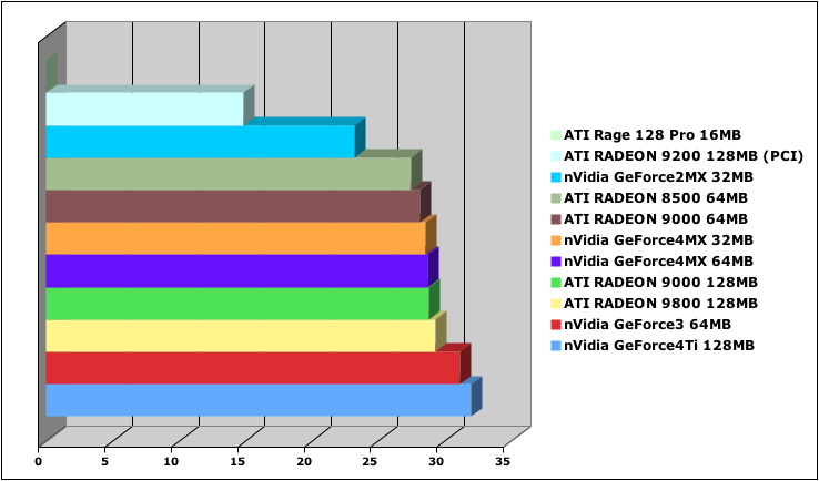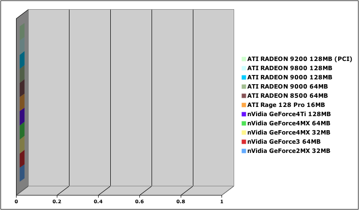 Shaders: None (varies between cards too much - none is more of a fair test between brands), no FSAA, 1024x768 resolution, 32 bit color. All other details set to the standard defaults.