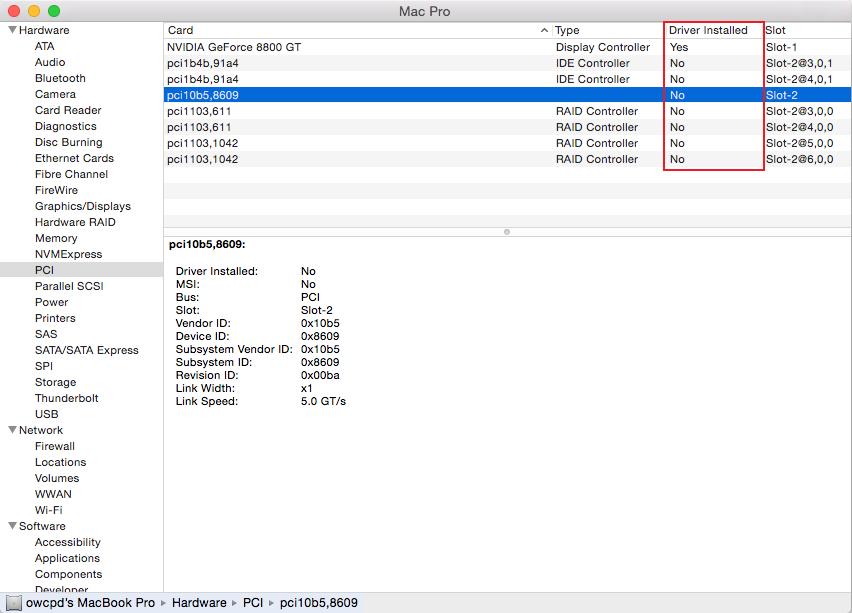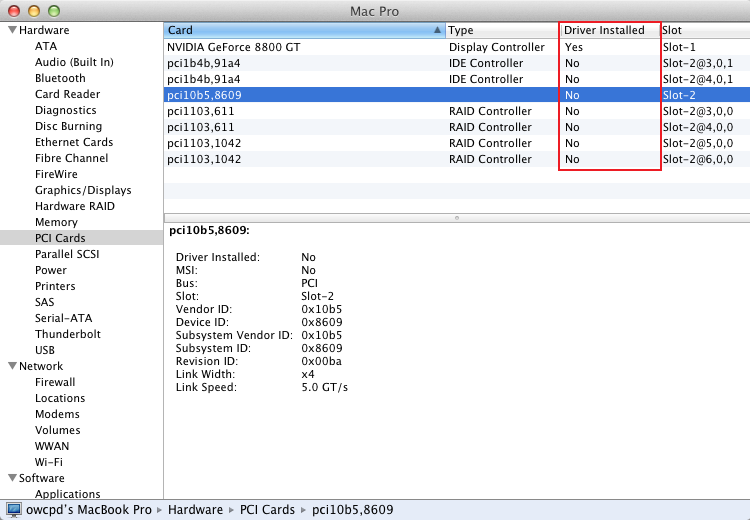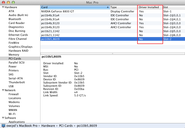 Scenario 3: The Driverless Card (NWTMXPCIE2E2U3) Installed in a Mac Pro with 10.8.2 or earlier (not supported). Depending on the version of OS X you have, you may see only two items that say "yes" under "Driver Installed", or potentially no items.