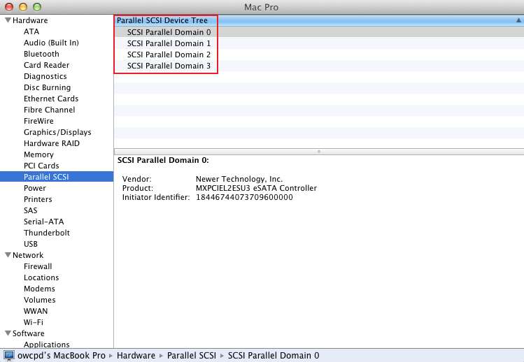 Scenario 4: The card which requires a driver (NWTMXPCIEL2ESU3), installed in a Mac Pro with 10.8.2 or earlier (supported). Note in this case that you will also see information in the "Parallel SCSI" section (second screenshot below). In this example the card is also installed in the proper slot to give maximum bandwidth, similar to Scenario 2.