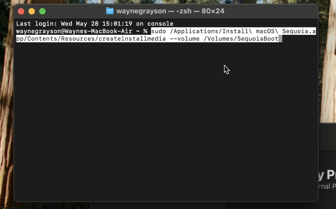 - For example: If you named your drive “SequoiaBoot”, the command would be: