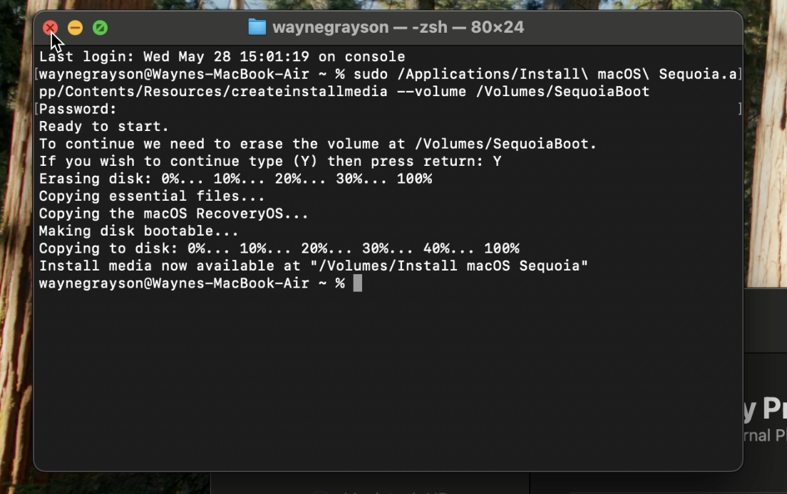 - sudo /Applications/Install\ macOS\ Sequoia.app/Contents/Resources/createinstallmedia –volume /Volumes/SequoiaBoot