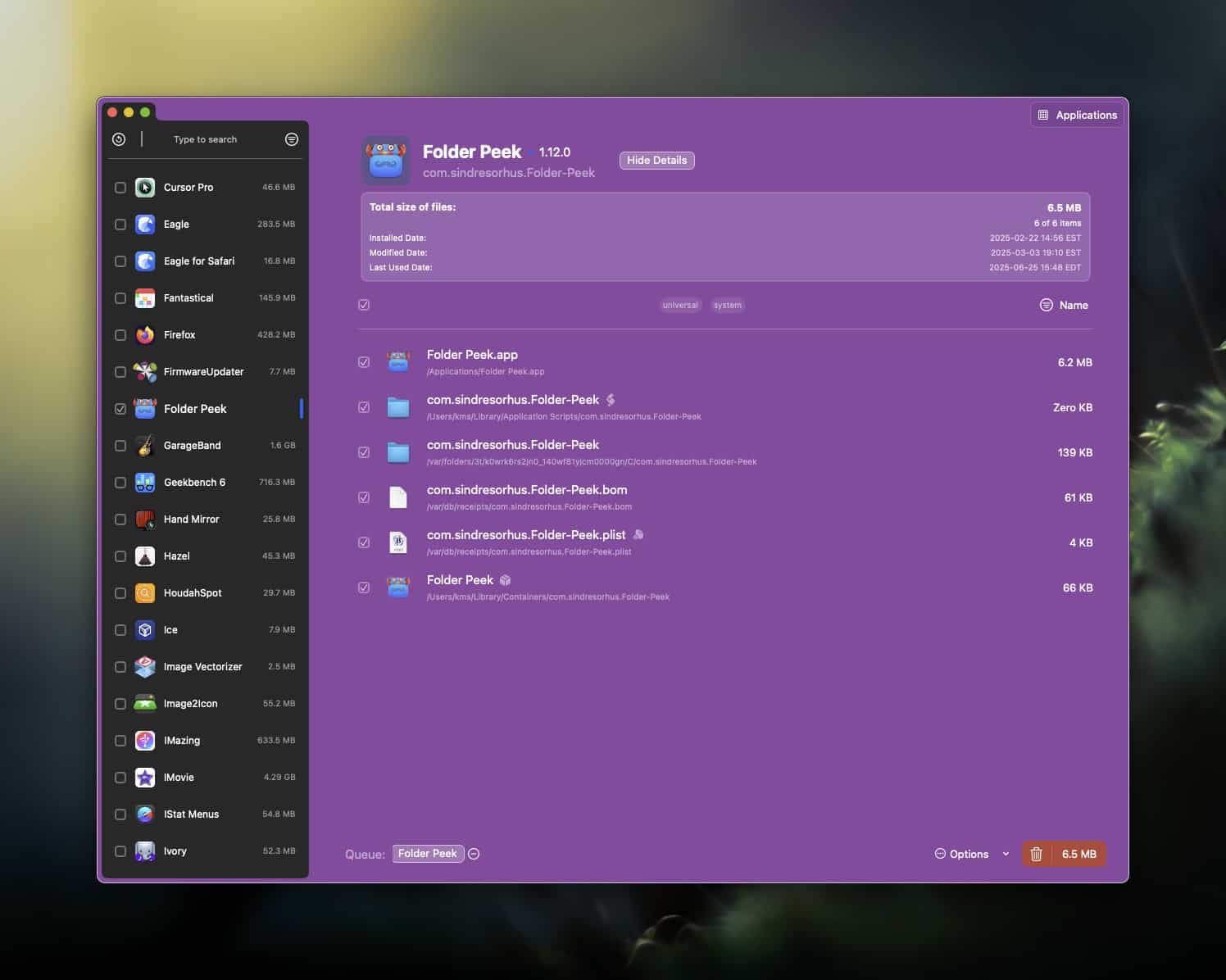 PearCleaner’s main window is divided into two main sections. On the left is a sidebar, which lists all of the Mac apps installed on your system, along with their corresponding file size. Next to each app is a checkbox. Simply select the app you want to remove by clicking its checkbox. PearClear’s main section will then reveal pertinent details about the app you’ve chosen. Each file / folder that is a part of the app will be shown, along with an option to select individual files to uninstall. To uninstall an app, simply click on the red “Trash” button.