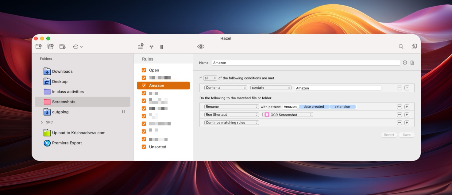 Next, I made a rule for one of my vendors: Amazon. For this rule, I have Hazel process the contents within the screenshot of an Amazon invoice, looking for the word “Amazon”. If Hazel detects the word “Amazon” inside the screenshot, the program will automatically rename the file with the prefix Amazon followed by the date that the screenshot was created, and keep the appropriate file extension (usually .jpg).