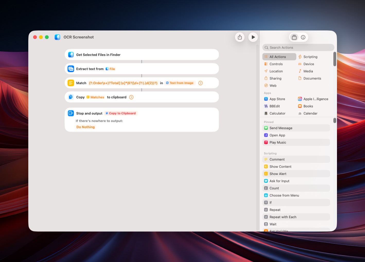 Additionally, each vendor rule includes a “Run Shortcut” command, which, when executed, will run the “OCR Screenshot” Shortcut on the screenshot, looking for the words “Order Total: $”. If it finds that string in the screenshot, the Shortcut will copy the contents of the value next to that text string into the Mac’s clipboard, so that I can conveniently paste it into my accounting software.