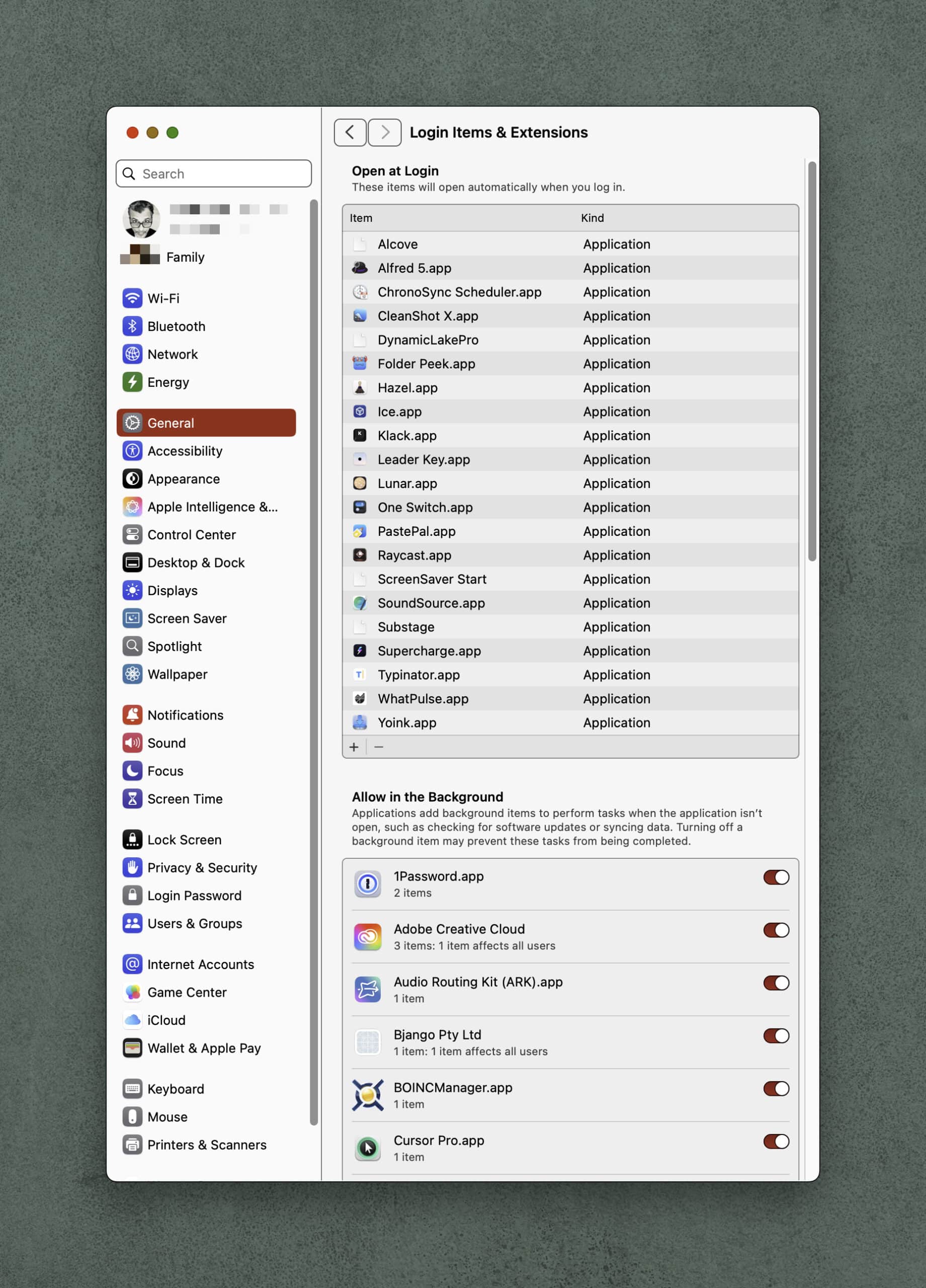 It’s a good idea to periodically check which apps you’ve granted to open at login. Some apps will request permissions to be placed back on the list, while others will inexplicably add themselves back in without asking you. (I’m looking at you, Microsoft Sharepoint.)