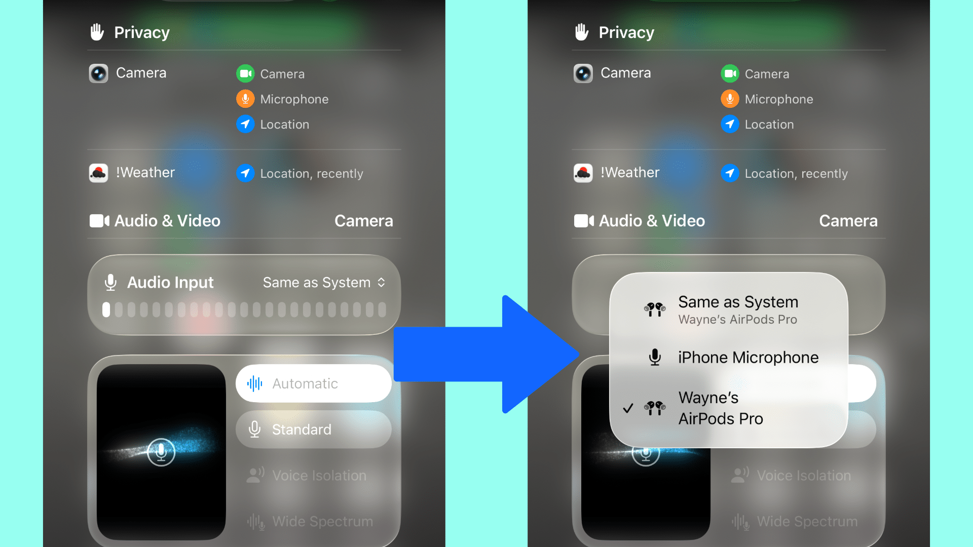 - Swipe down from top right→ Control Center → Camera Controls → Input → pick your AirPods.