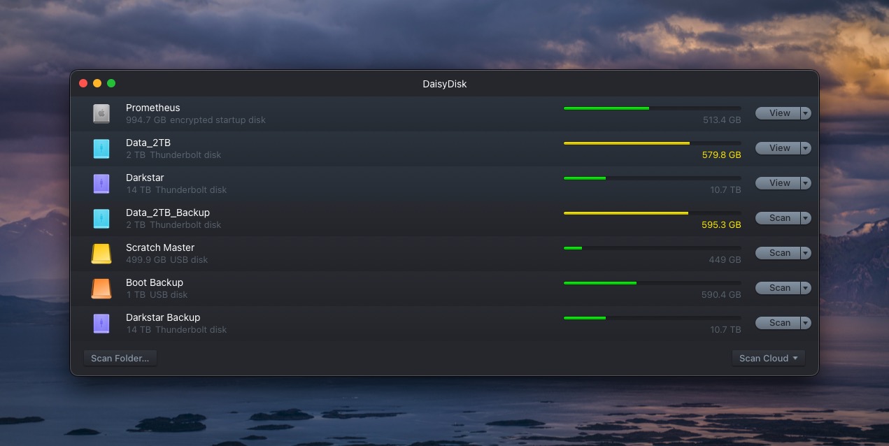 When DaisyDisk launches, it presents a list of all of the storage devices connected to your Mac. Next to each drive is a visual bar that shows how much used /free space exists. Each visual bar is color coded: green, yellow, or red. As a drive fills up over time, this bar can go from green to yellow to red.