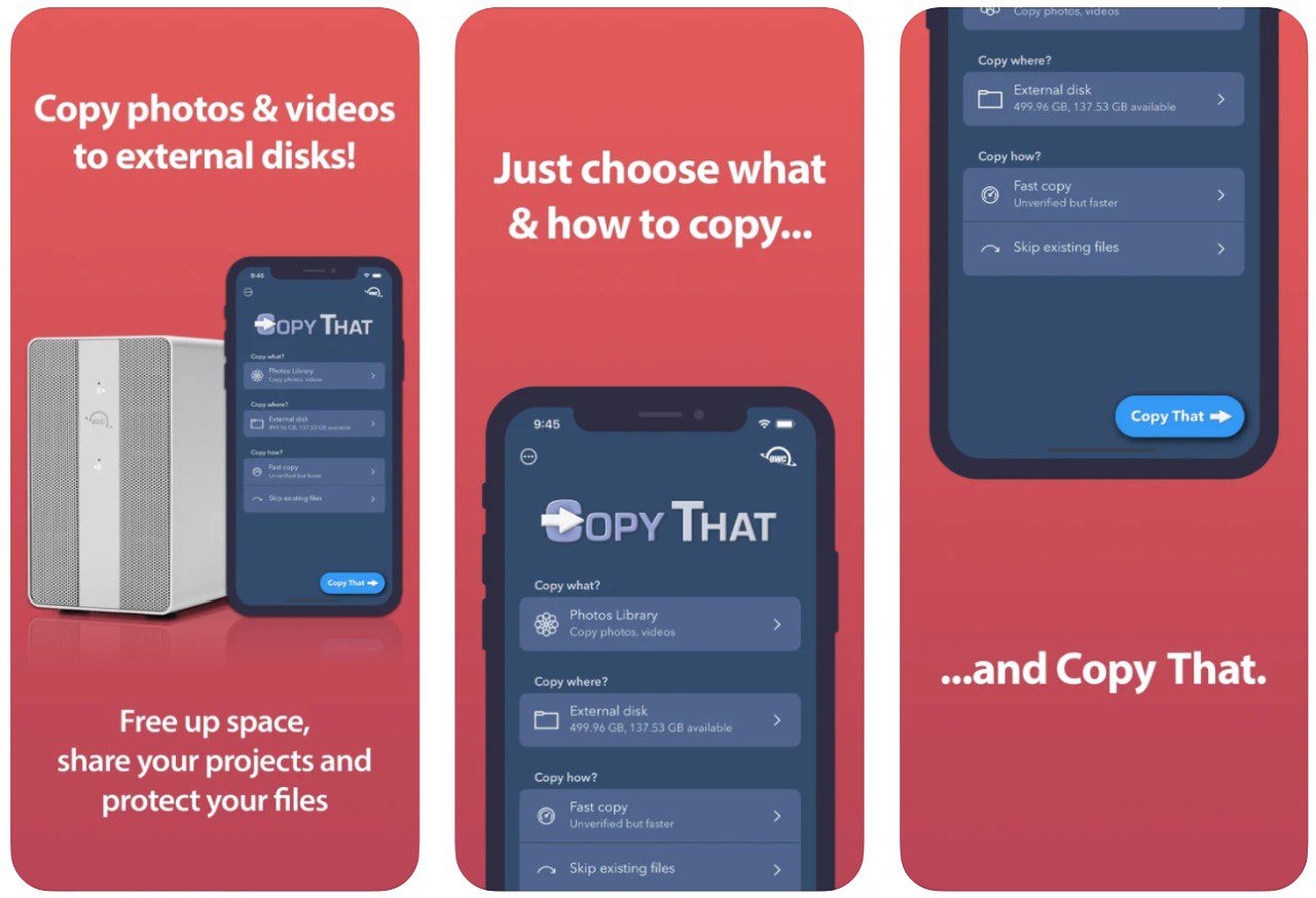 OWC Copy That is an app that lets you easily copy photos and videos from your iPhone / iPad directly to external storage devices. It gives you the ability to select what you want to copy, where you want to copy, and how you want to copy your data and is available now for iOS and iPadOS.