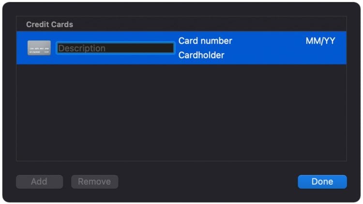 It’s easy to use Safari in macOS Sierra (and later) and iCloud Keychains to keep your credit card data in sync between your Mac and iOS devices. And it’s easy to add or remove a credit card. Note: Keychain is the password management system in macOS. A Keychain can contain various types of data: passwords, private keys, certificates, and secure...
