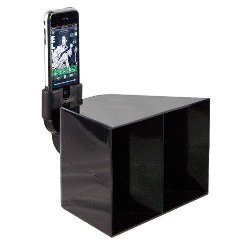 The Ampli-Phone is a scientifically designed horn that provides remarkable amplification of the speaker built into your iPhone. Place your iPhone in the dock cradle, and enjoy room-filling sound with surprising fidelity. You can even charge or sync your iPhone while it is using the Ampli-Phone®, and if you make or receive a call, you will be able to use the speaker phone function and converse from several feet away.