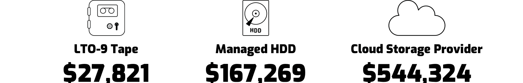 In addition to offering a much lower acquisition cost per terabyte vs disk-based storage, the Archive Pro Ethernet delivers the best ROI, longevity, and carbon footprint of any archiving method. In a 10-year model study, Solutions North Consulting (SCN) determined LTO-9 tape-based archiving offers a 501% ROI compared to HDD storage and up to 1856% ROI compared to cloud storage. Additionally, based on an eight-year life cycle, SCN found tape media has a carbon footprint that is over 25 times lower than HDDs and 55 times lower than SSDs.3