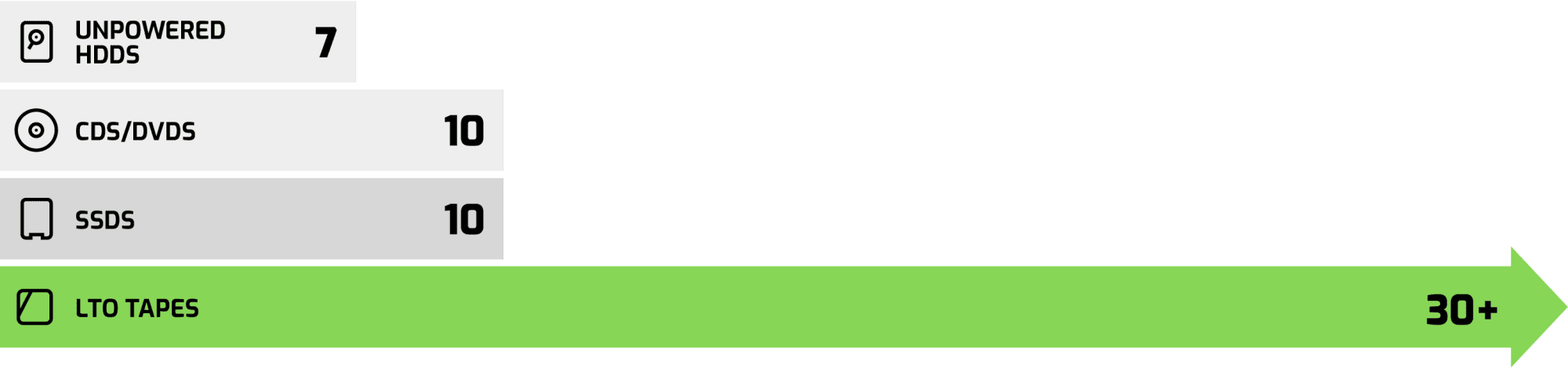Whether you have an existing LTO tape archive or want to start archiving with the latest generation tape, you can configure the Archive Pro Ethernet to meet your data needs: