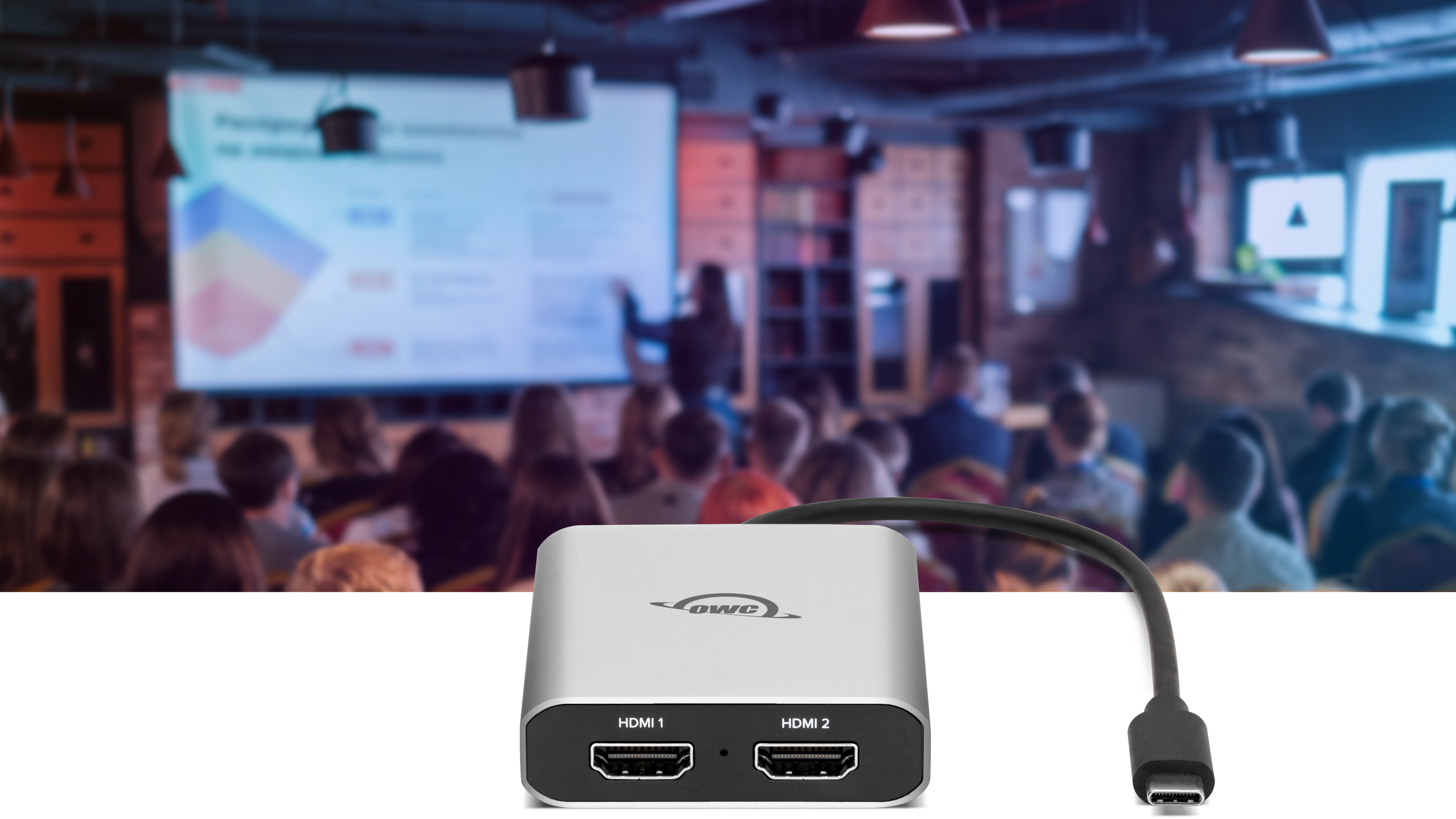 Palm-sized with an integrated connecting cable, you can place the OWC USB-C Dual HDMI 4K Display Adapter discreetly in your workspace or easily carry it in a gear bag to remote multi-display setups and BYOD (Bring Your Own Device) business or classroom presentations. Plus, this innovative adapter is backward compatible so you can use it with any HDMI display, projector, or TV at its maximum resolution.