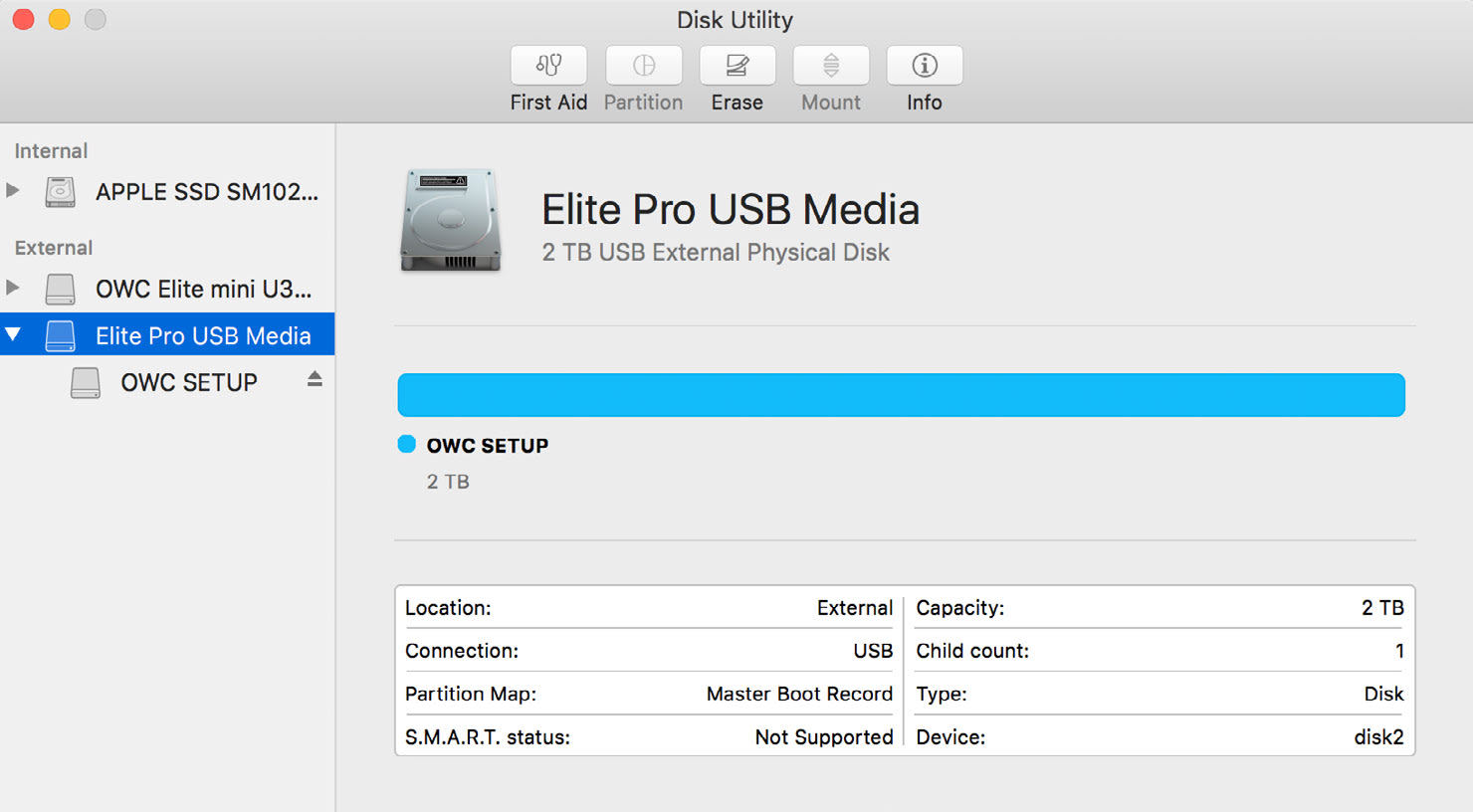Note: If you’re using a new, external drive from OWC for the first time, notice the physical disk has a volume associated with it called “OWC Setup”. If you are using Disk Utility to format the drive and you don’t need the bundled software (or prefer to access it from your online account), you can ignore this default volume.