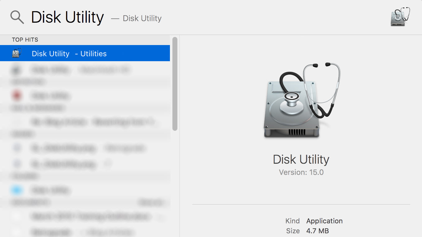 Click the magnifying glass icon in the top-right corner of your screen. Type ‘Disk Utility’. The first search result should automatically highlight the application. Press the Return key or double-click the name to launch the application.