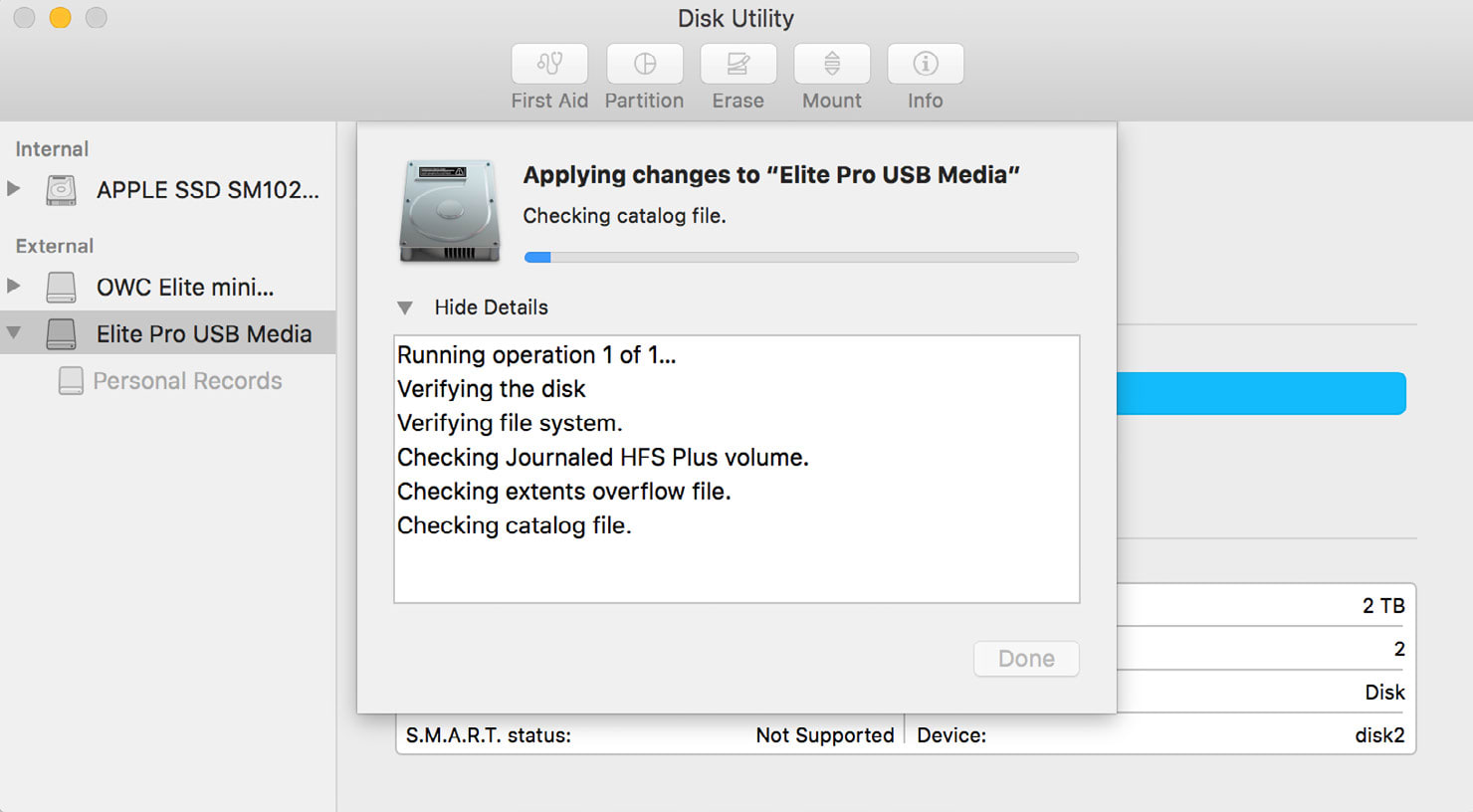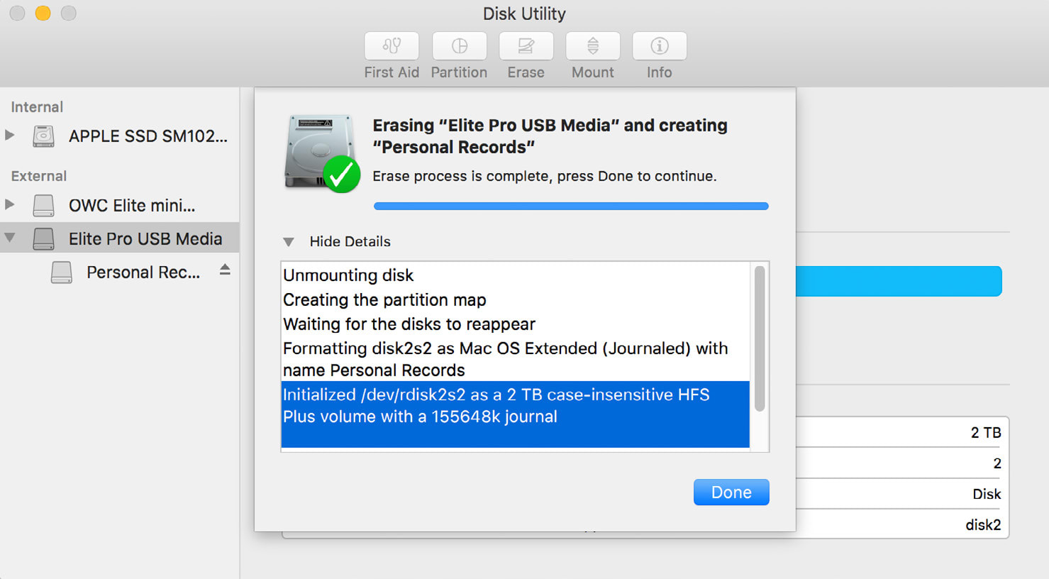 It may take a minute or two for the drive to be formatted and initialized. Once the process is complete, you should see a new physical volume with the name you chose in Step 4, indented beneath the name of the physical disk. Click Done when you are ready.