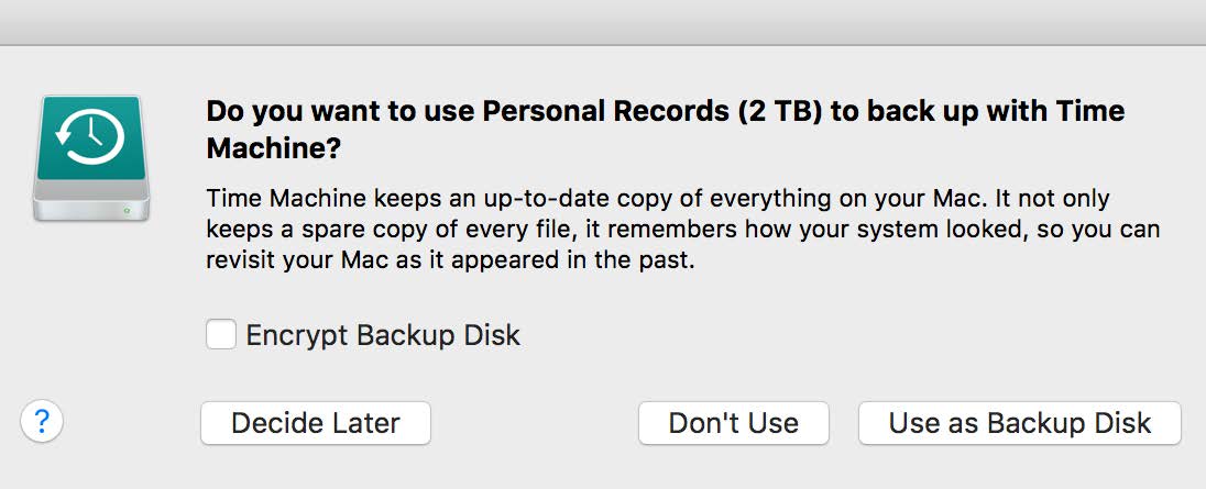 If you did intend to set up a Time Machine Disk, but you’re not storing sensitive information, it is a good idea to leave ‘Encrypt Backup Disk’ unchecked. This may aid in the recovery of data should something happen to your physical disk down the road. All drives will eventually fail, regardless of make or model.