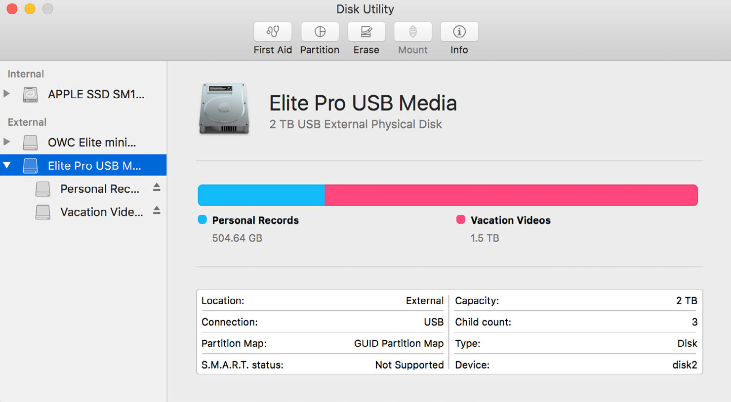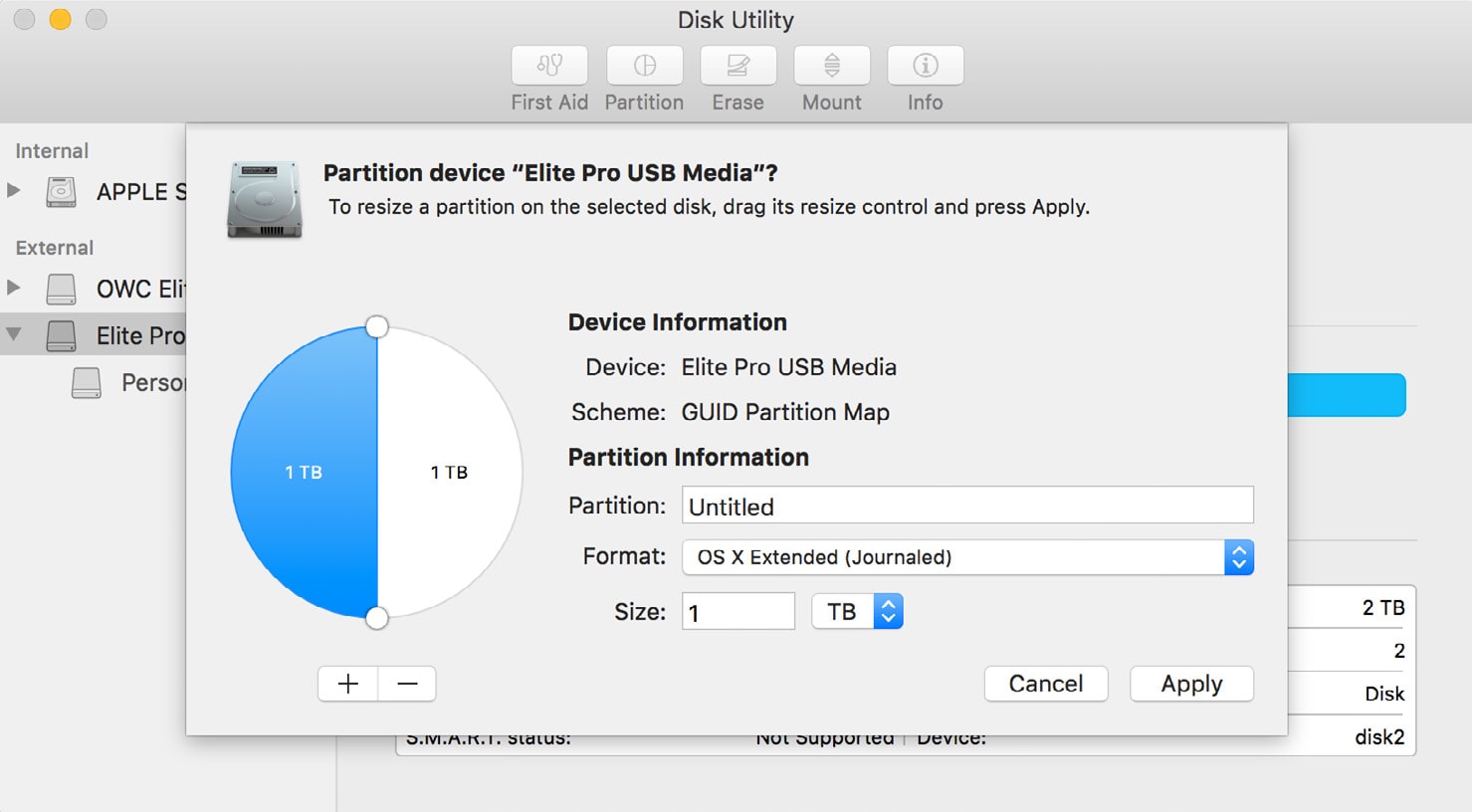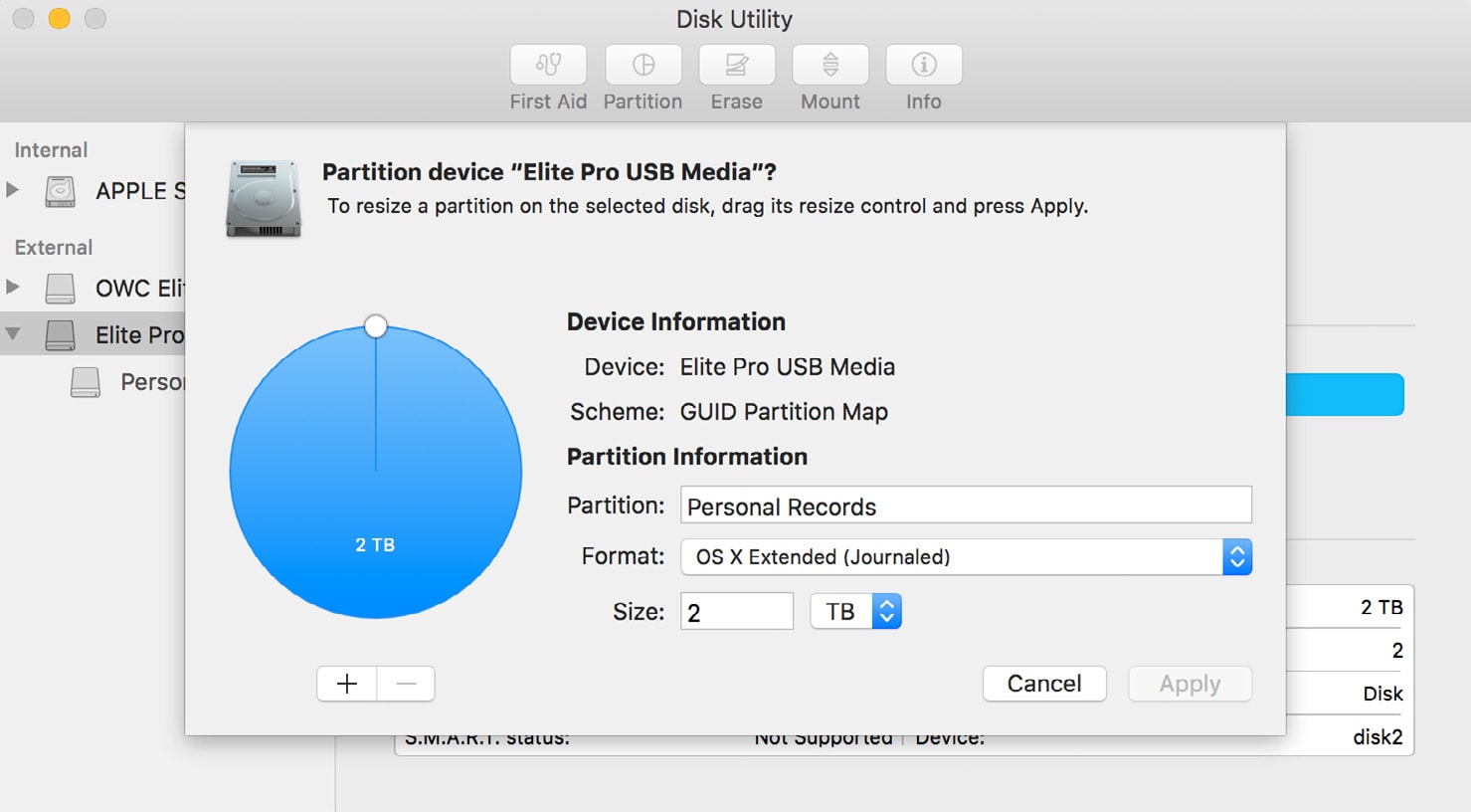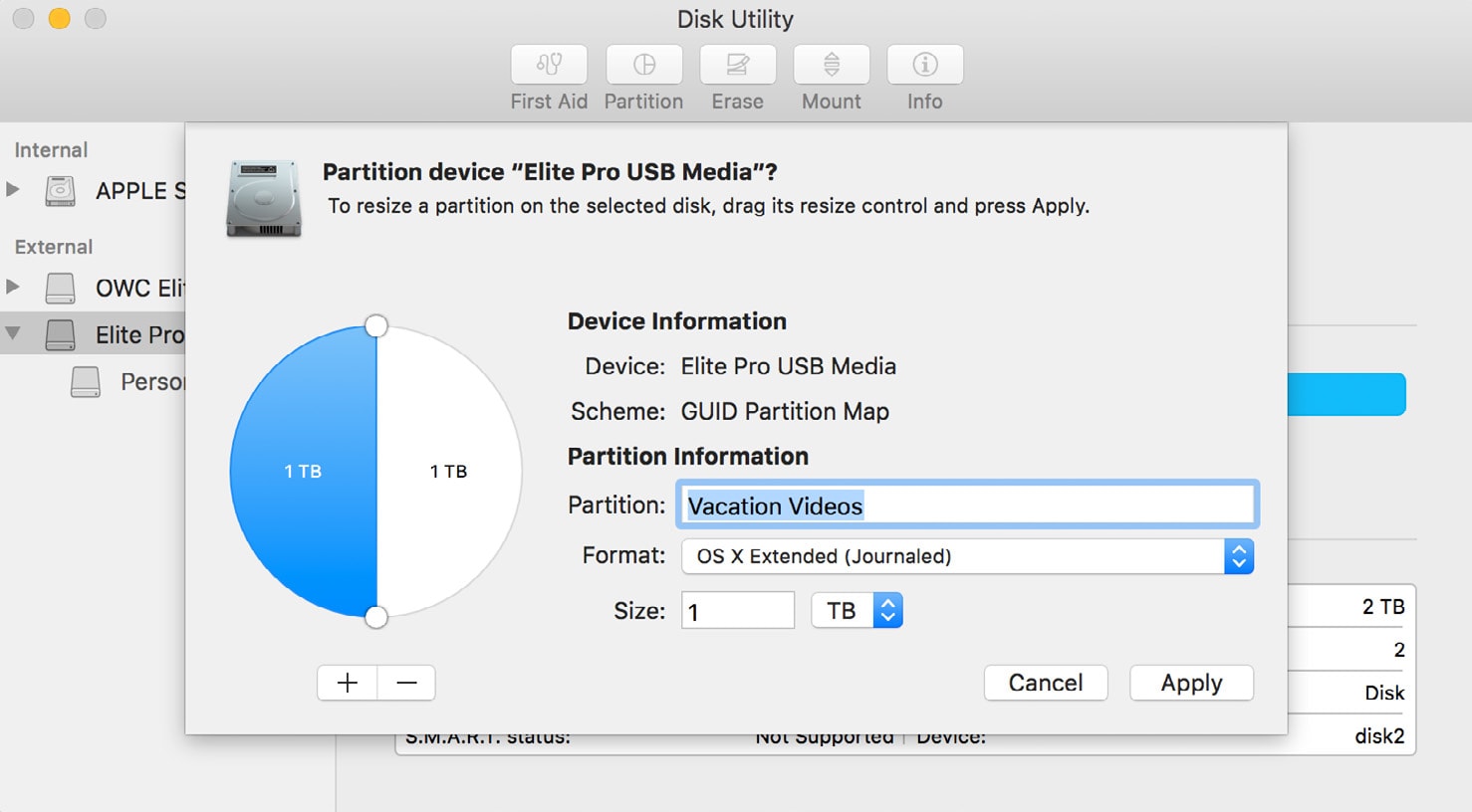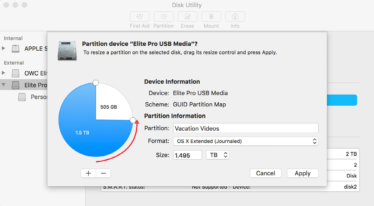 In this case, “Vacation Videos” will occupy 1.5TB of the total 2TB space available on the physical disk. As noted previously, you can leave the format at its default if the new partition is strictly for use with Macs, or choose ExFAT if the partition needs to be accessible to both Macs and PCs.