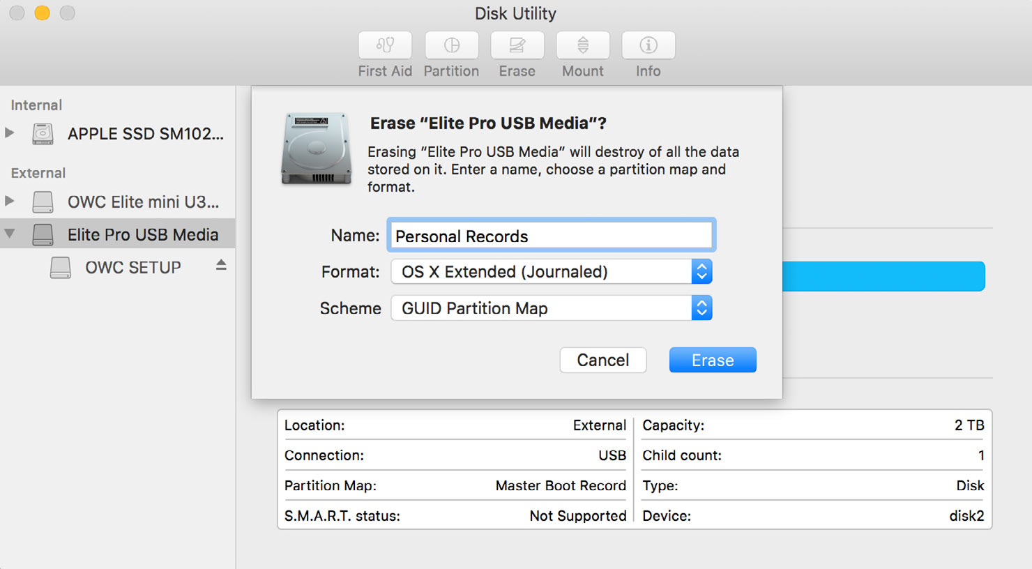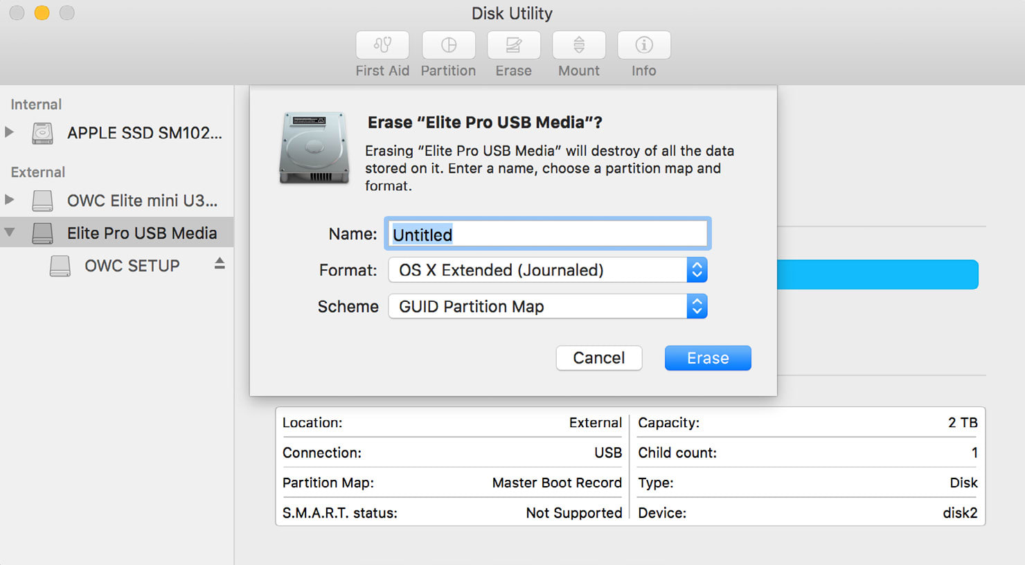 Note that the physical disk’s partition map scheme (listed as ‘Scheme’ in the screenshot at right) is now part of the ‘Erase’ process, rather than the partition process. This too should remain at the default setting (‘GUID Partition Map’), even if you’re using ExFAT as the format.