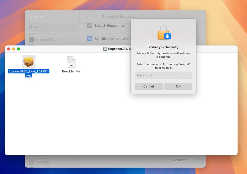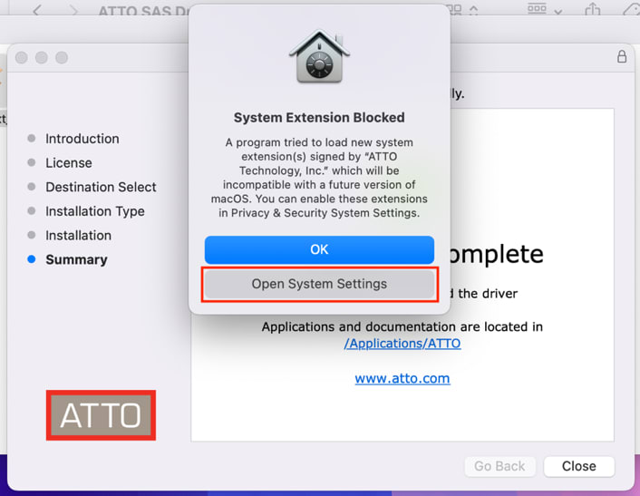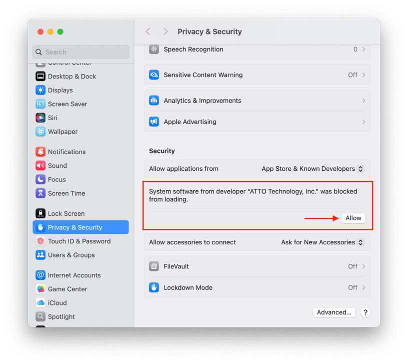 21. After your computer restarts, log in to your account and open the “System Settings” application. Navigate to the Privacy & Security window and scroll down to the “Security Section.” If there is a button asking to allow software from “ATTO Technology, Inc” to load, click it. If not, the driver has successfully installed.