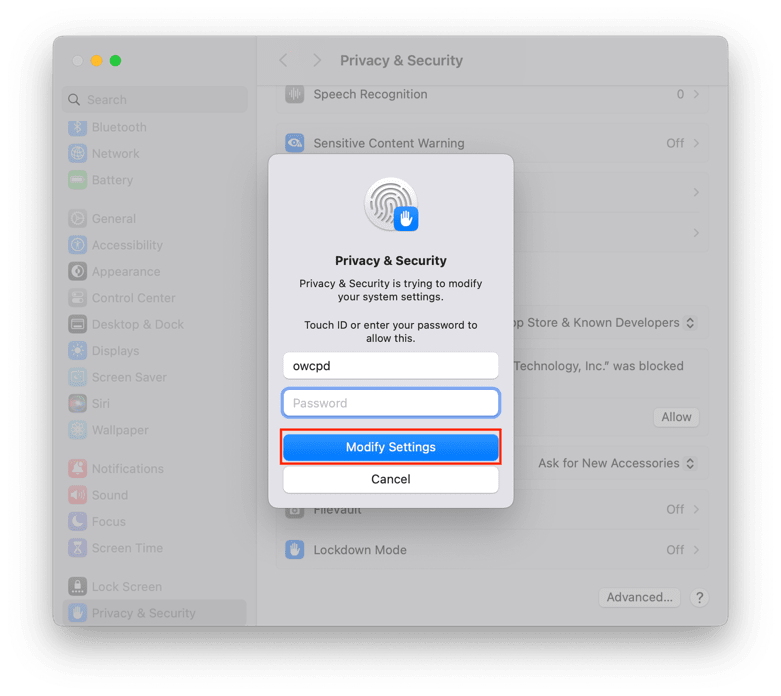 17. In the “Privacy & Security” window, select “Allow” to allow the ATTO software to load. Enter your administrator password when prompted for your credentials and click “Modify Settings”