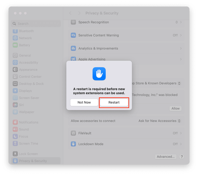 15. The software will install. A popup will show up saying “System Extension Blocked”. Do not click anything until the installation in the background completes. Then click “Open System Settings” on the popup.