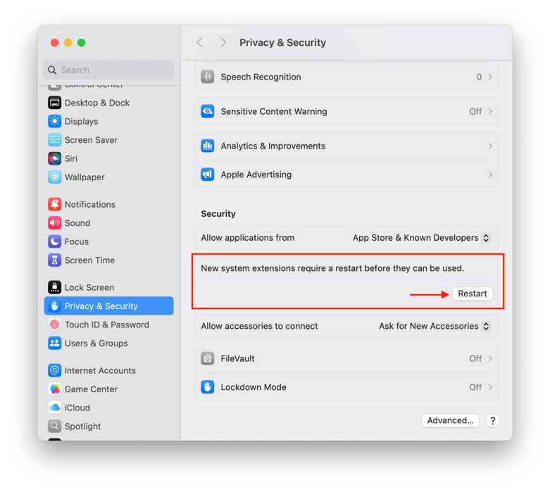 5. Click the Apple logo in the top left corner and select “Restart”. NOTE: You must restart your Mac for the changes to take effect.