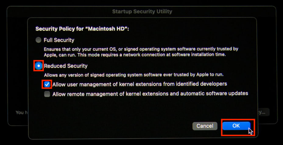 • Full Security—The default setting that brings the highest level of security. An active Internet connection may be required at software installation time so the Mac can confirm that it’s booting up a macOS or Windows version that hasn’t been tampered with in any way. Leave this setting enabled to run a macOS or Windows version that’s currently installed on the Mac, or any cryptographically signed operating system trusted by Apple.