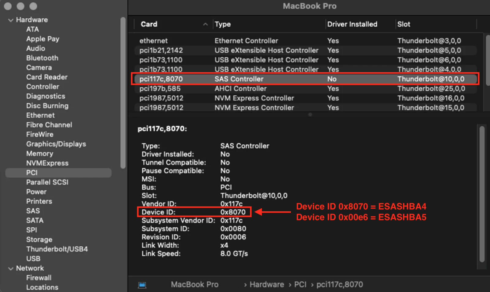 The ATTO SAS driver must be installed based on the ATTO ExpressSAS HBA that is installed in your OWC LTO chassis. To determine which HBA is installed, open System Information and navigate to the PCI section.