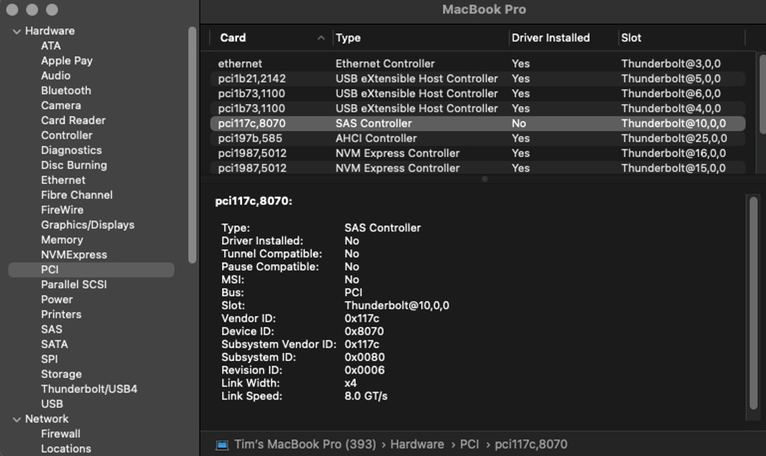 1. Open the System Profiler and select the PCI tab in the navigation pane.