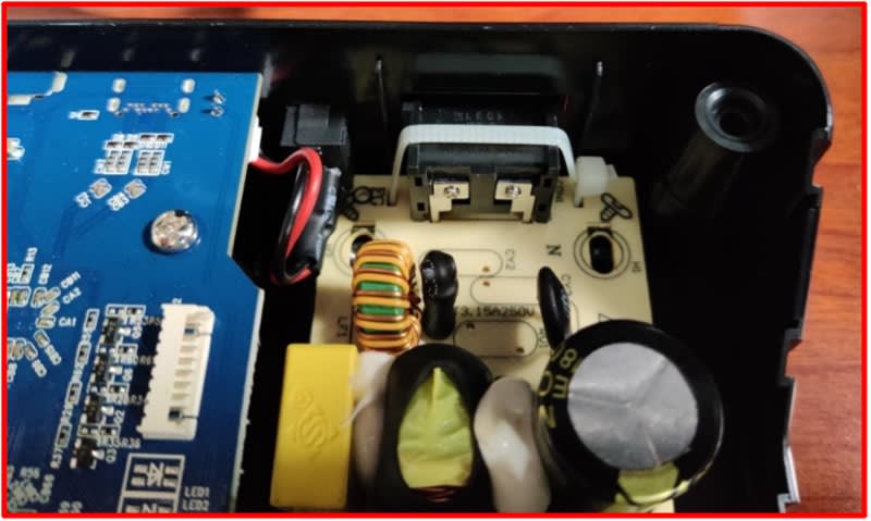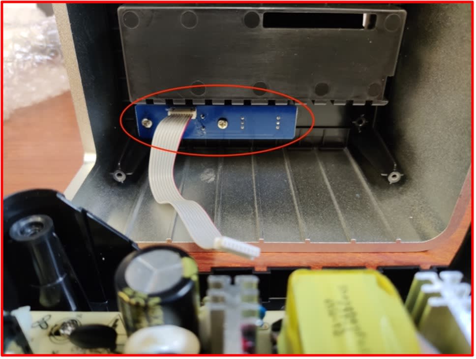 - Ensure the smaller blue board (highlighted) will be over the new power supply when the silver casing is pressed into the black base.