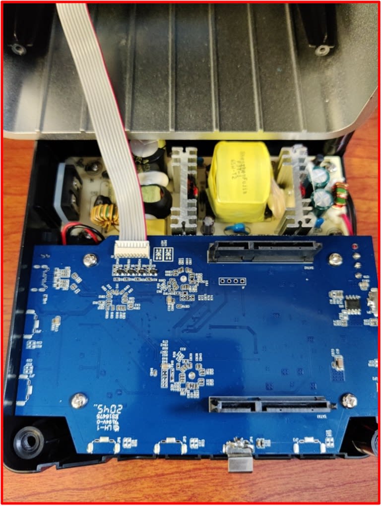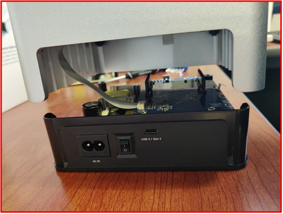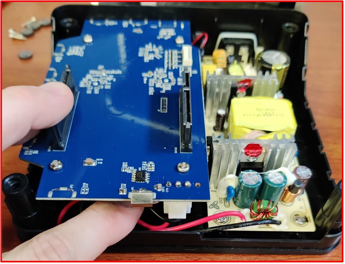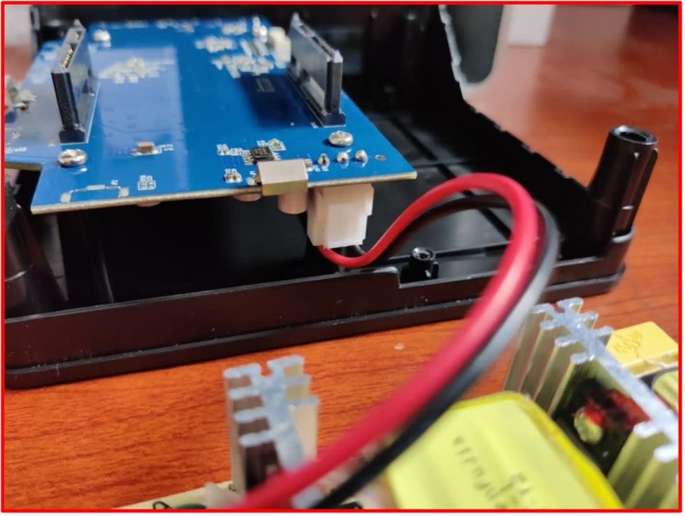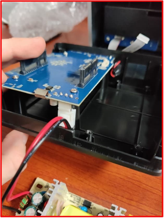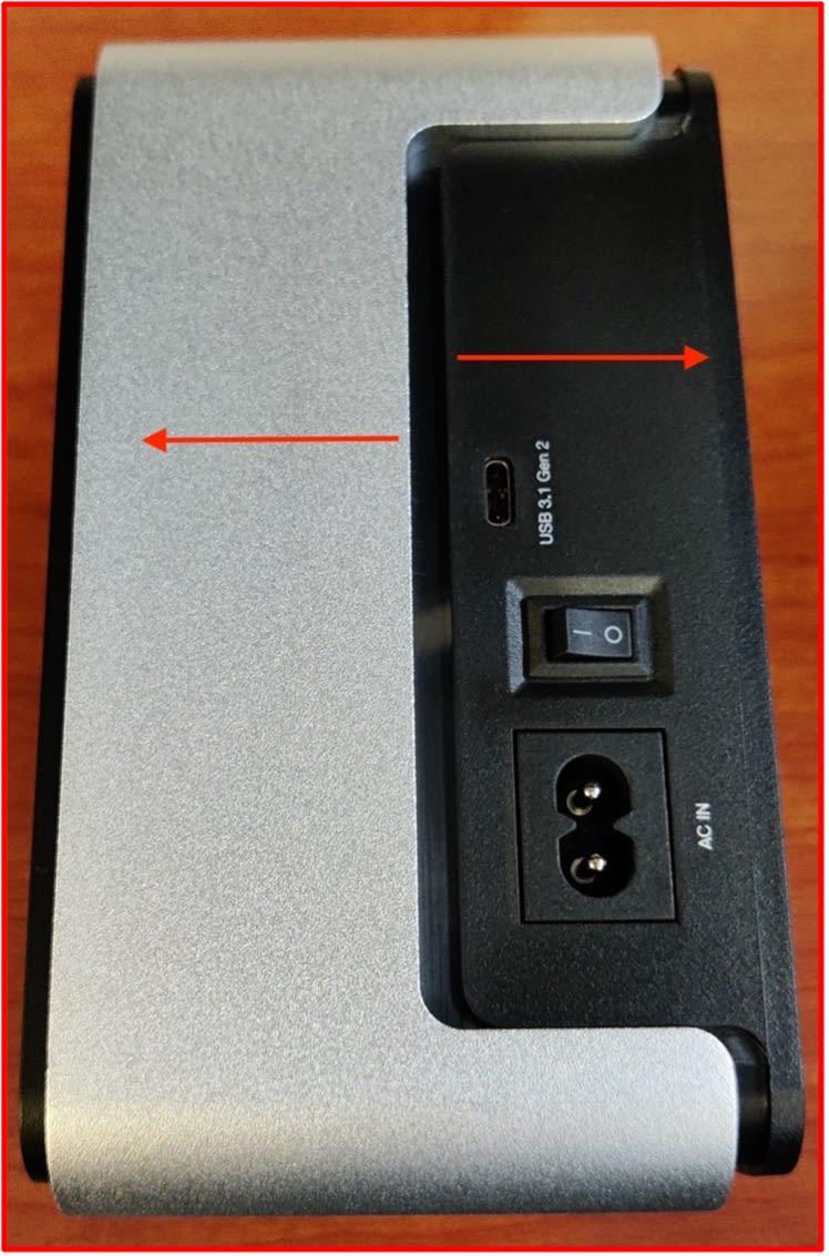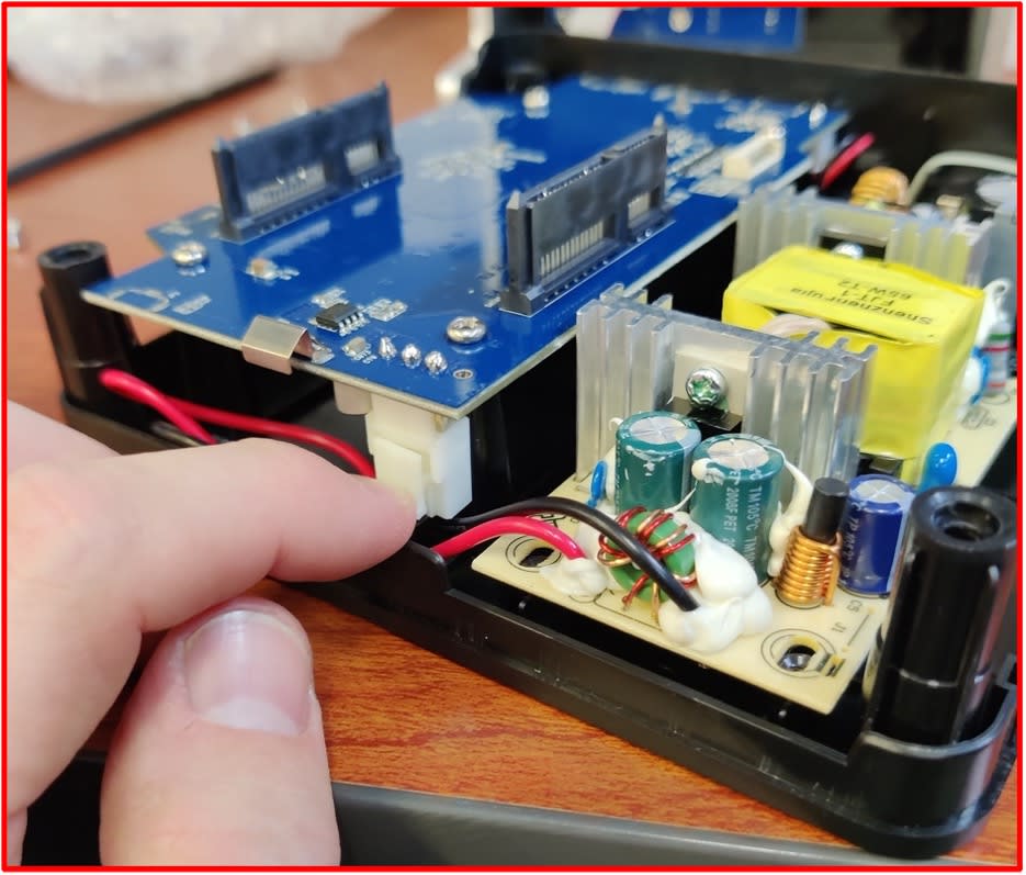 - Check that the SATA connections are peeking through the silver casing (highlighted) before fully pressing the silver casing and black base together.