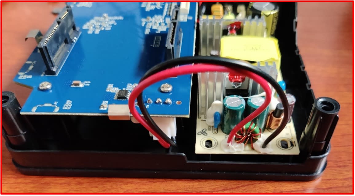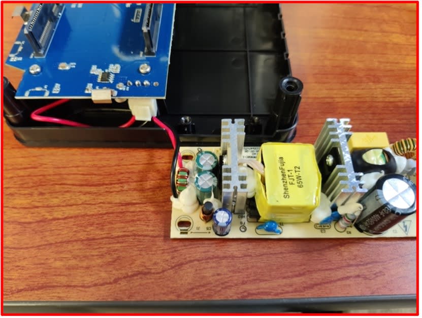 - Slide the power supply away from the housing, and carefully lift the power supply and place it outside the black base.