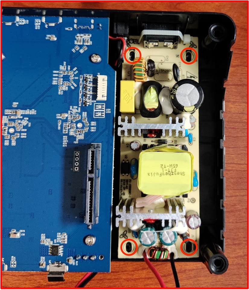 4. Remove the power supply screws (highlighted) using a PH00 screwdriver. Safely store the power supply screws for reassembly.