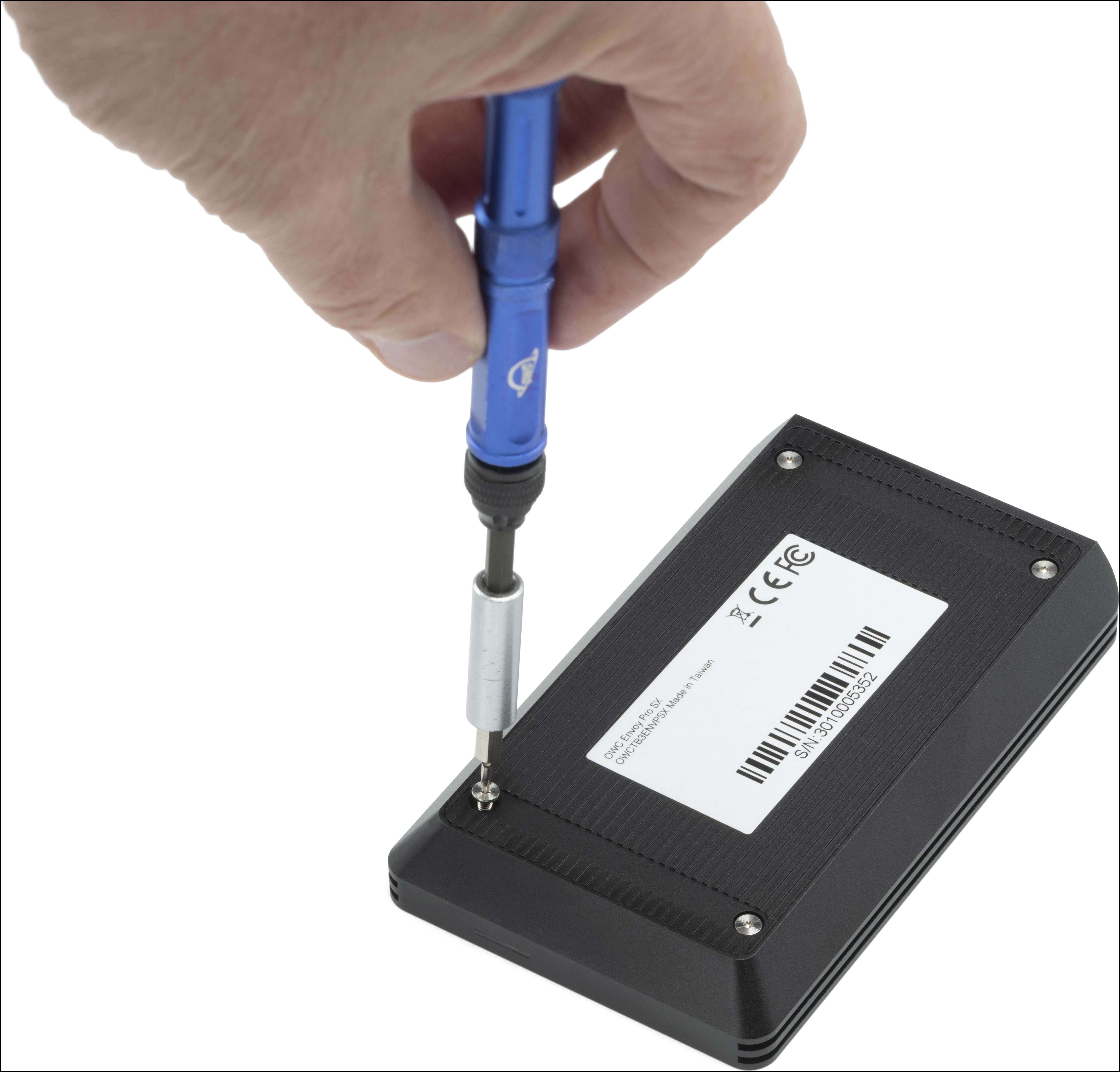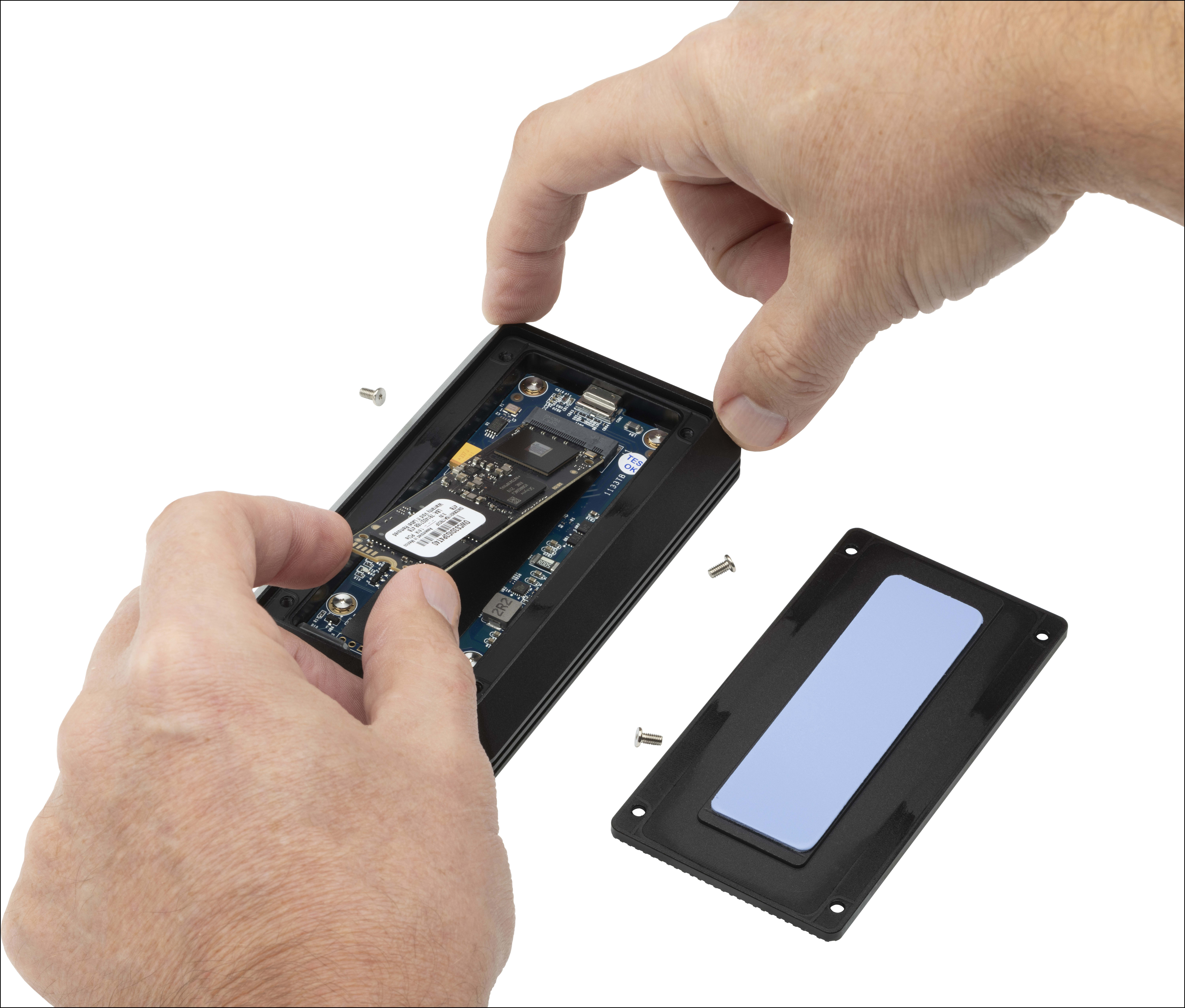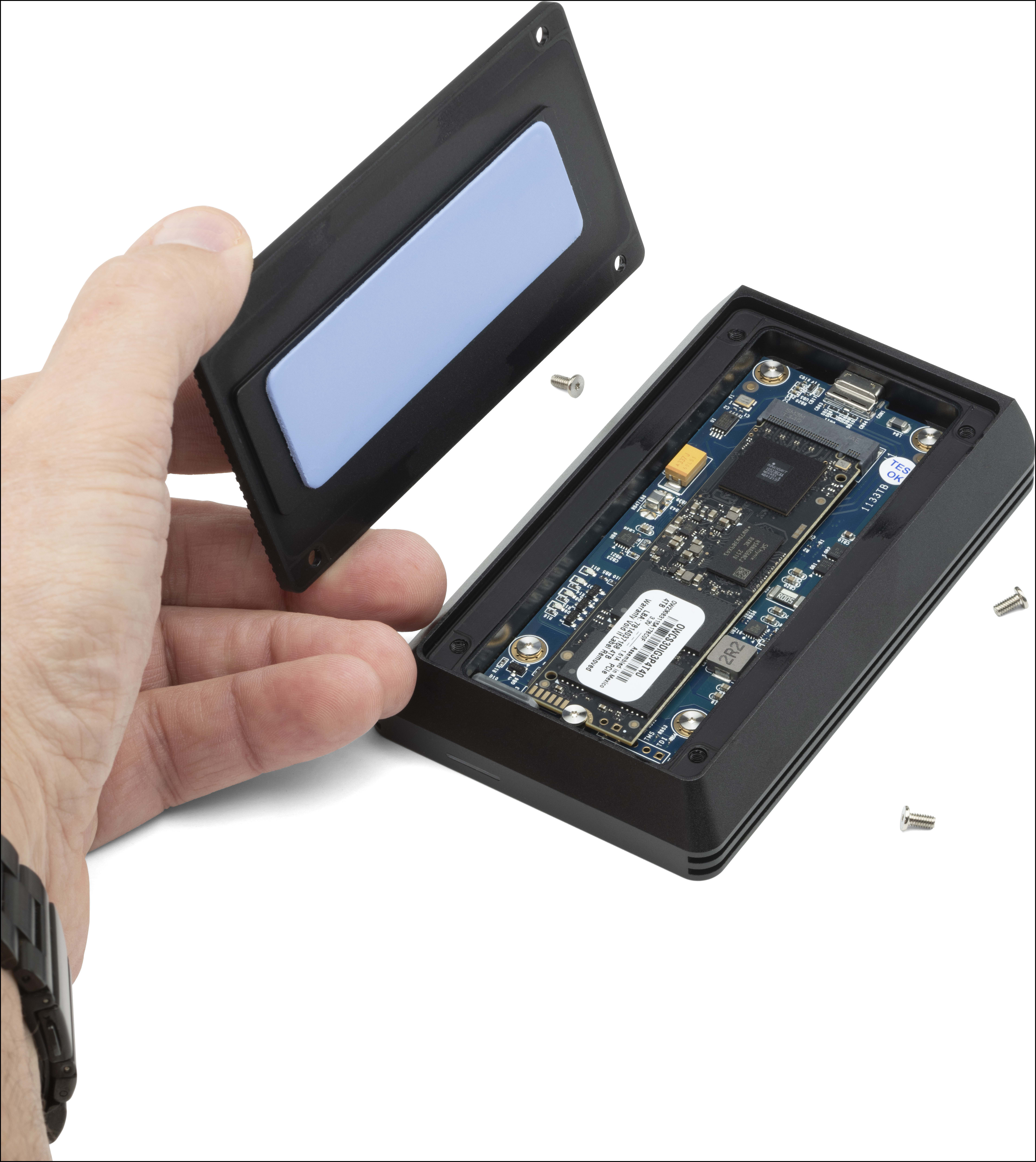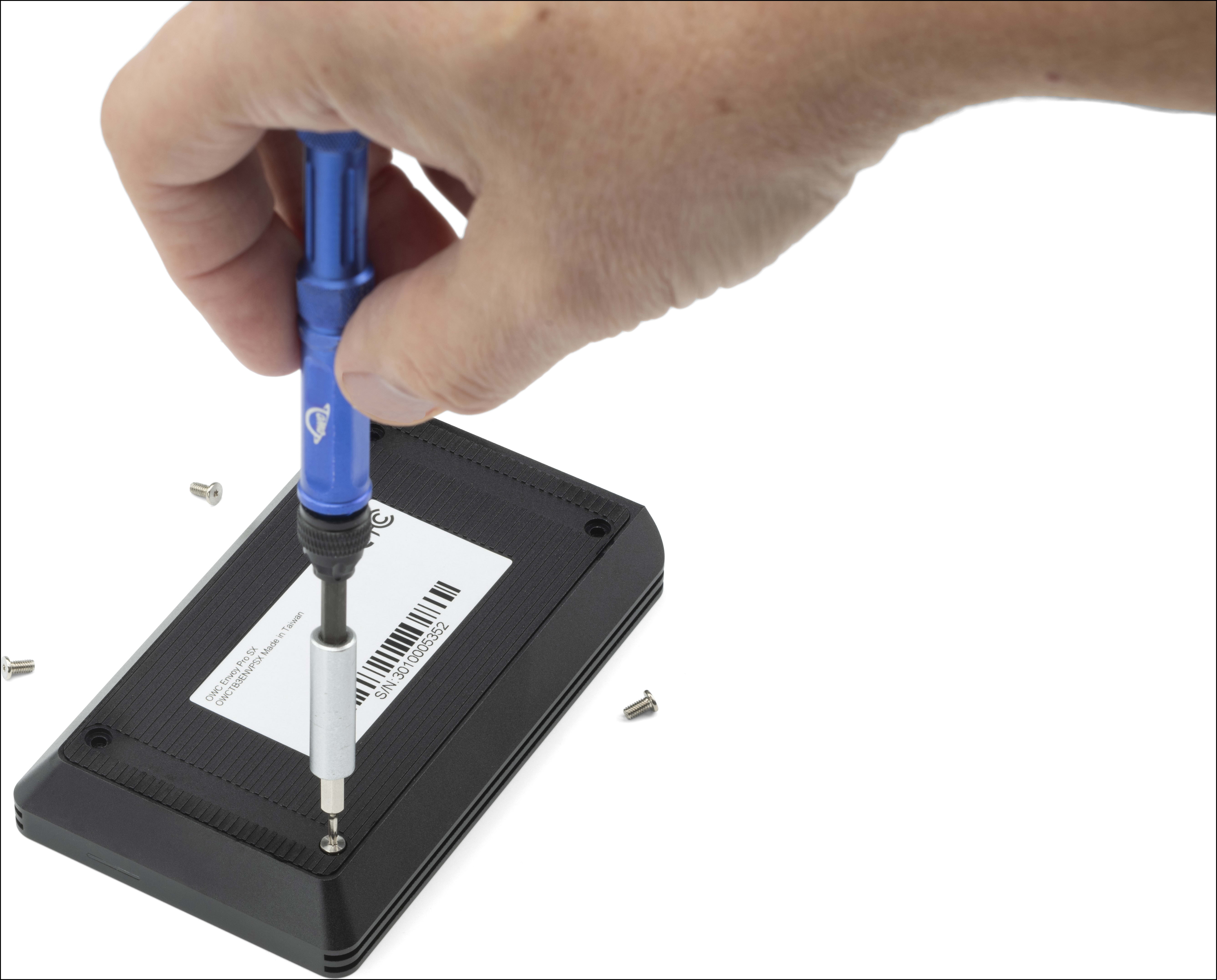 5. Place the cover back on the OWC Envoy Pro SX. Secure the cover using the (4) removed case screws form earlier.