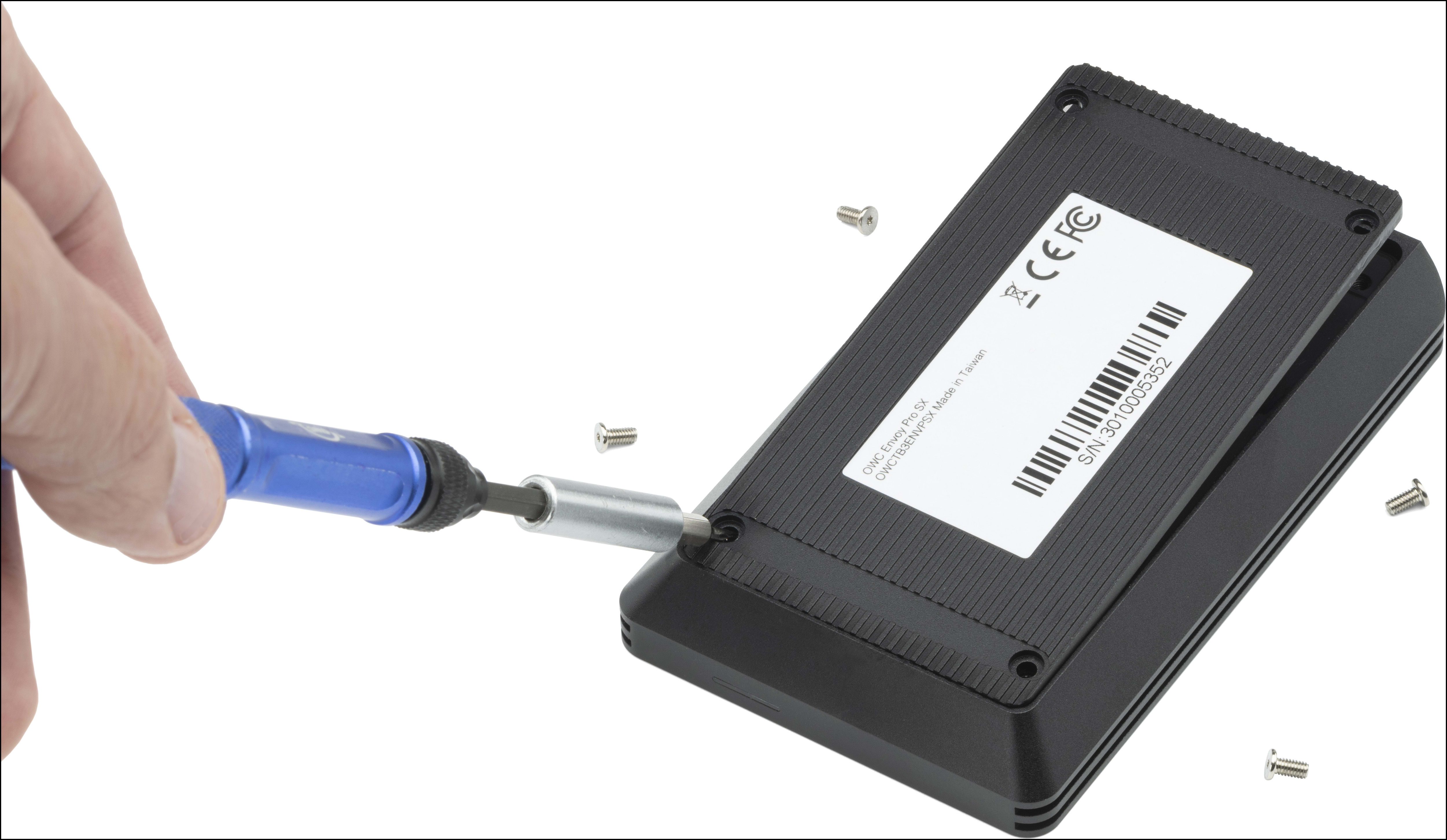 1. Place the OWC Envoy Pro SX upside down on a flat static free surface. Remove the (4) case screws which will allow access to the inside of the enclosure.