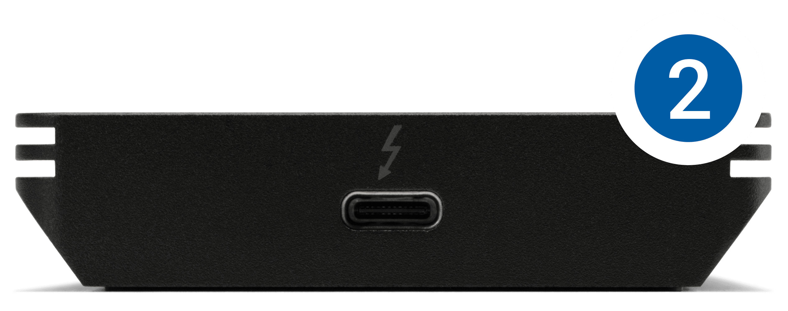 1. Connect the included Thunderbolt cable into the Thunderbolt (USB-C) port on the back of the OWC Envoy Pro SX. Connect the other end of the cable into a compatible host.