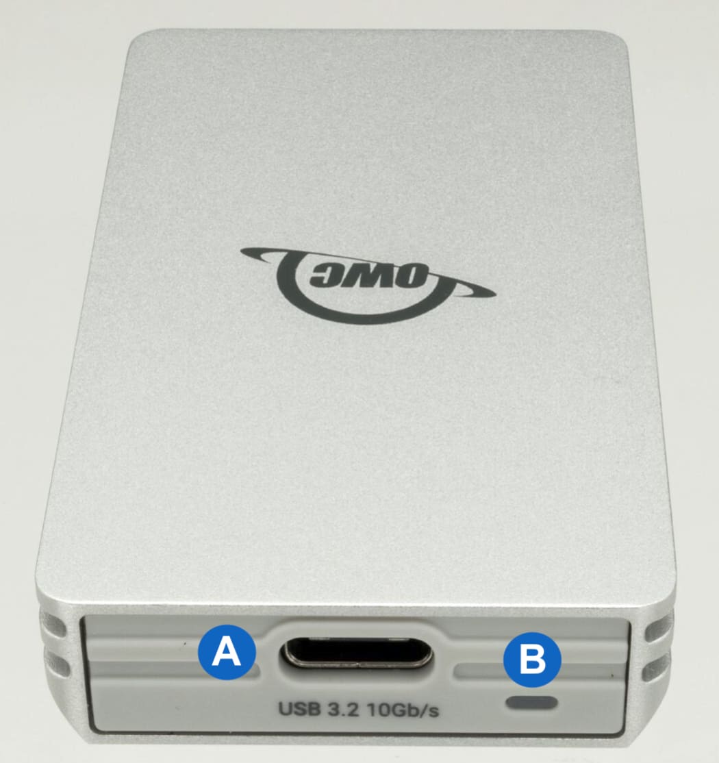 1. Connect the included 0.3M (12") USB-c to USB-C cable to the USB 3.2 Gen2 port on the back of the OWC Envoy. Connect the other end of the cable into a compatible host.