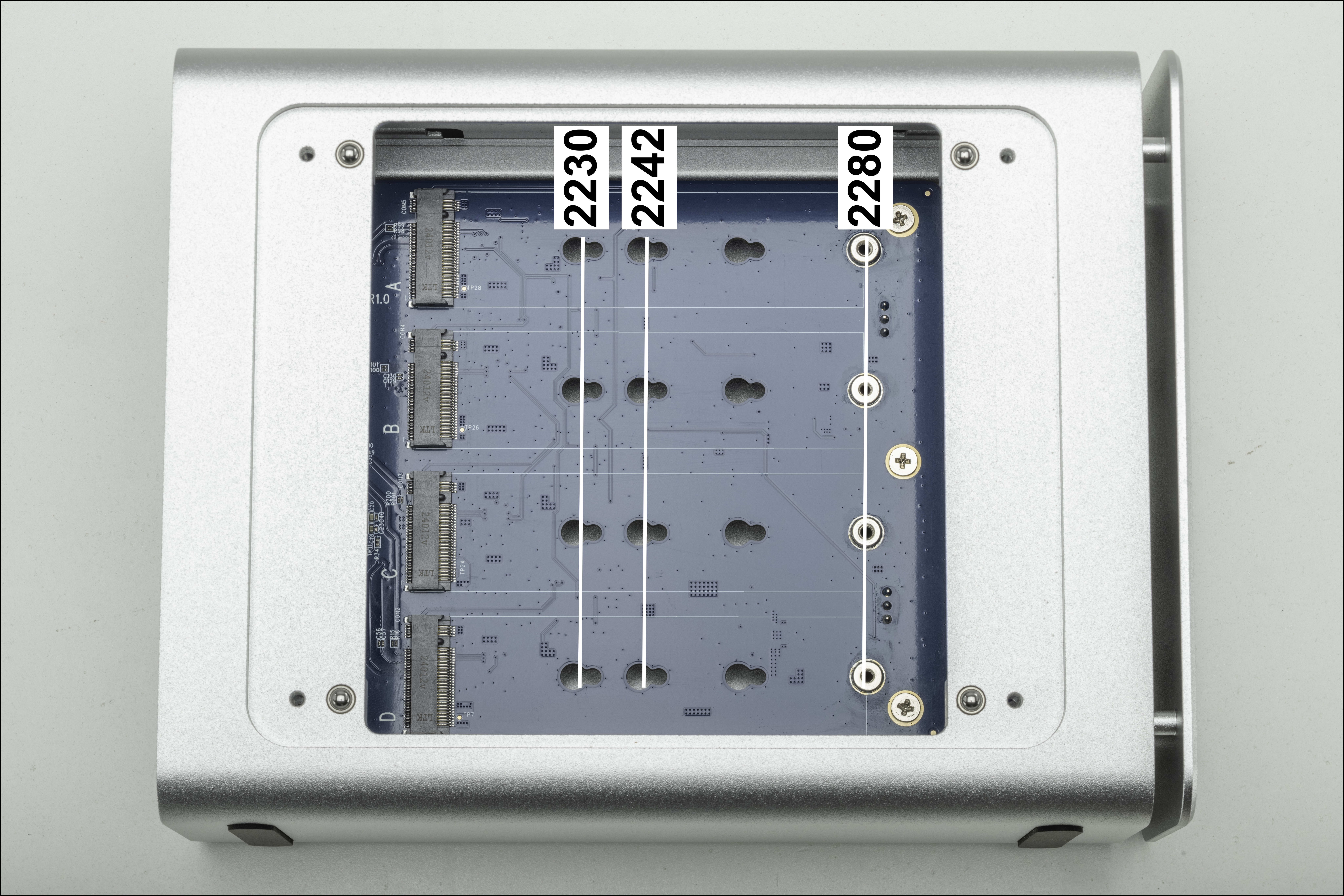 5. The OWC USB4 Express 4M2 supports 2280 | 2242 | 2230 NVMe M.2 SSD form factors. The image below identifies which column of drive post slots that should be used based on the desired form factor.
