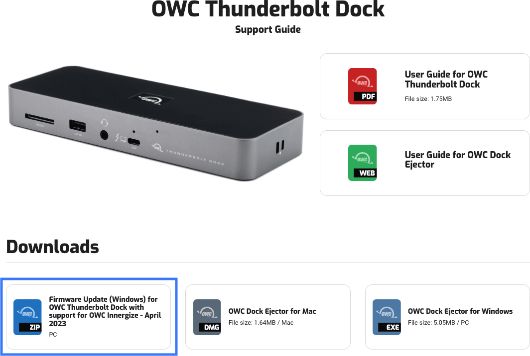 3. In the Windows environment, download the required firmware update ZIP file “Firmware Update with OWC Innergize support” by visiting the Downloads section on an applicable product support page listed below: