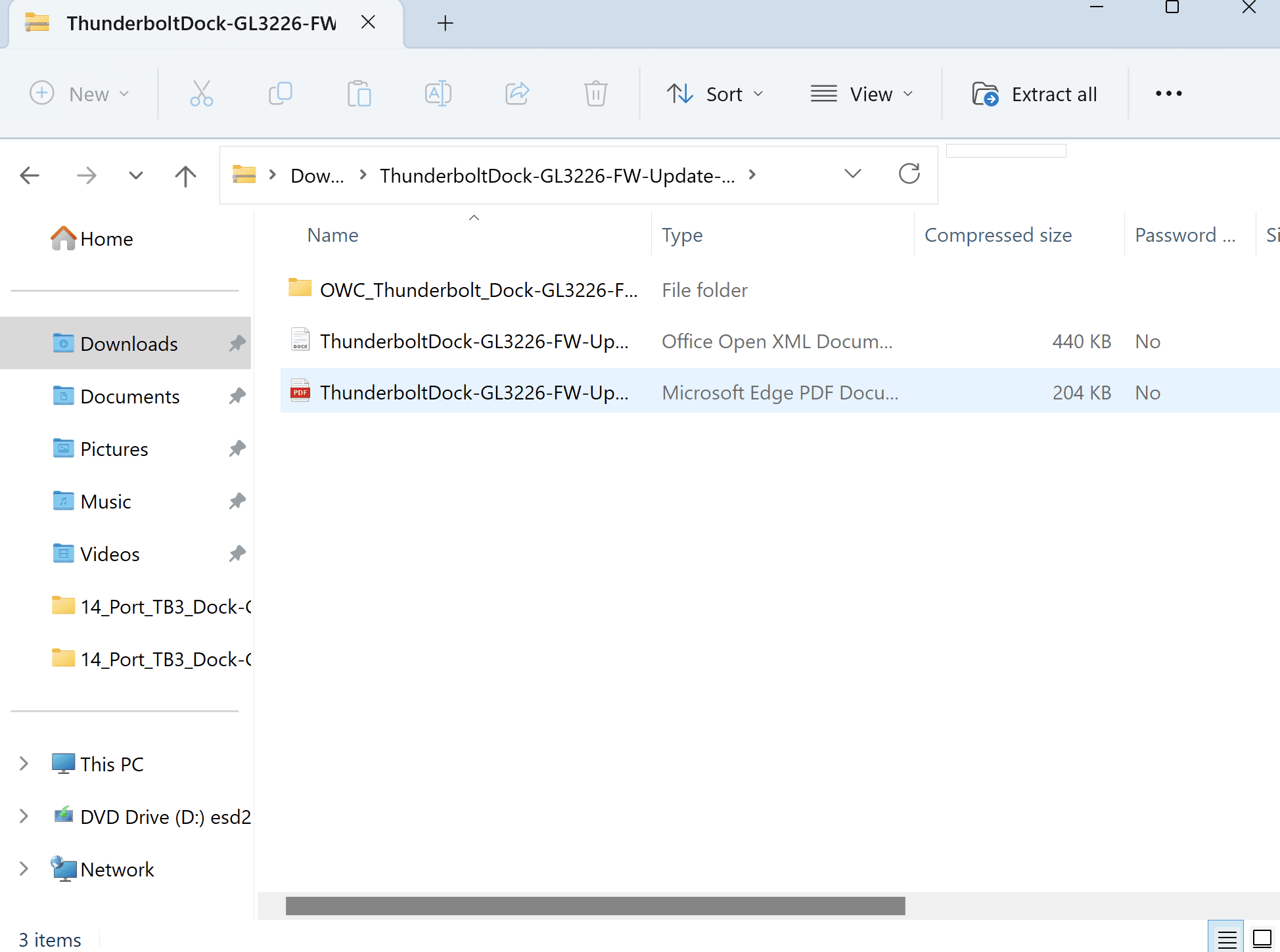 4. In the Windows environment, access the system Downloads folder and open the downloaded Compressed Folder. The compressed folder will open showing a firmware updater folder, and PDF/Word instructions for completing the firmware update process. Before accessing the firmware updater folder, open the instructions and proceed through the provided steps.