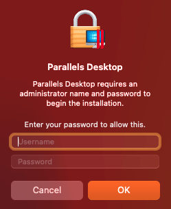 2. Launch Parallels once the installation process is complete. A prompt may appear requesting admin name and password for permission to run Parallels. Enter the requested information and click OK.