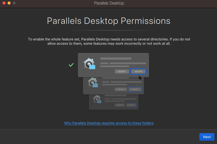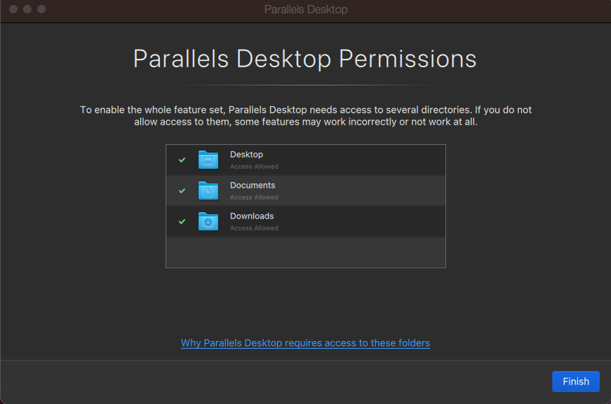3. Parallels will seek Desktop Permissions. Several prompts will appear seeking permission to access the systems directory. These prompts are safe to allow. Click Finish after allowing the prompts.