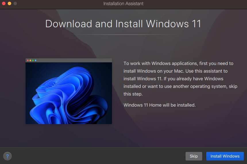 5. Once Parallels has finished downloading, a window will appear to begin the process of installing Windows. Click Install Windows to begin the installation process.