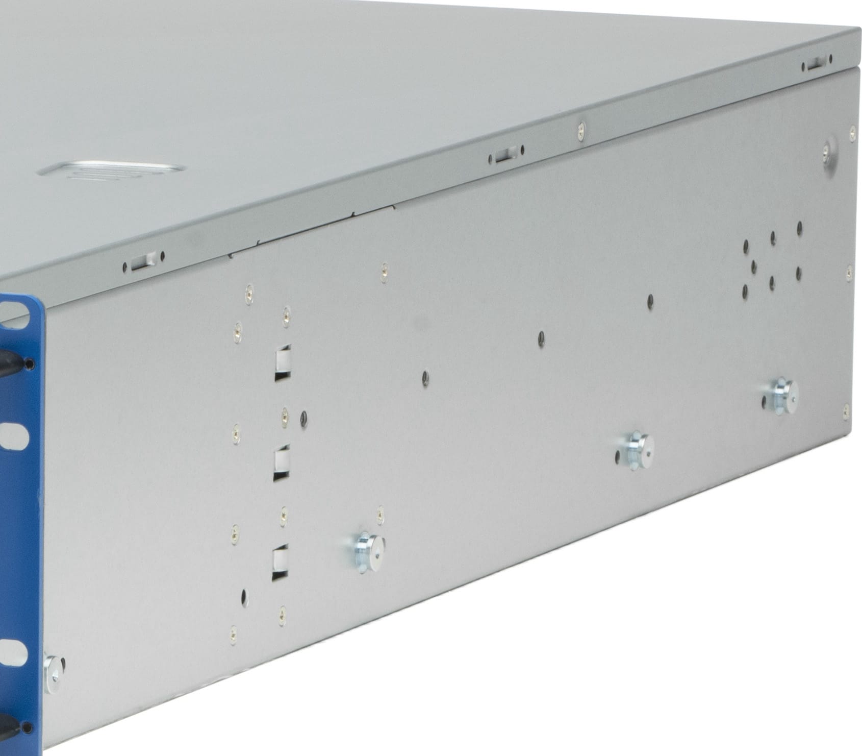 6. Install the four included rack securing screws to finish the unit installation into the rack as seen in Figure 2.2.1b. The 16-bay version is shown, but the screw placement is similar on the 8-bay version.