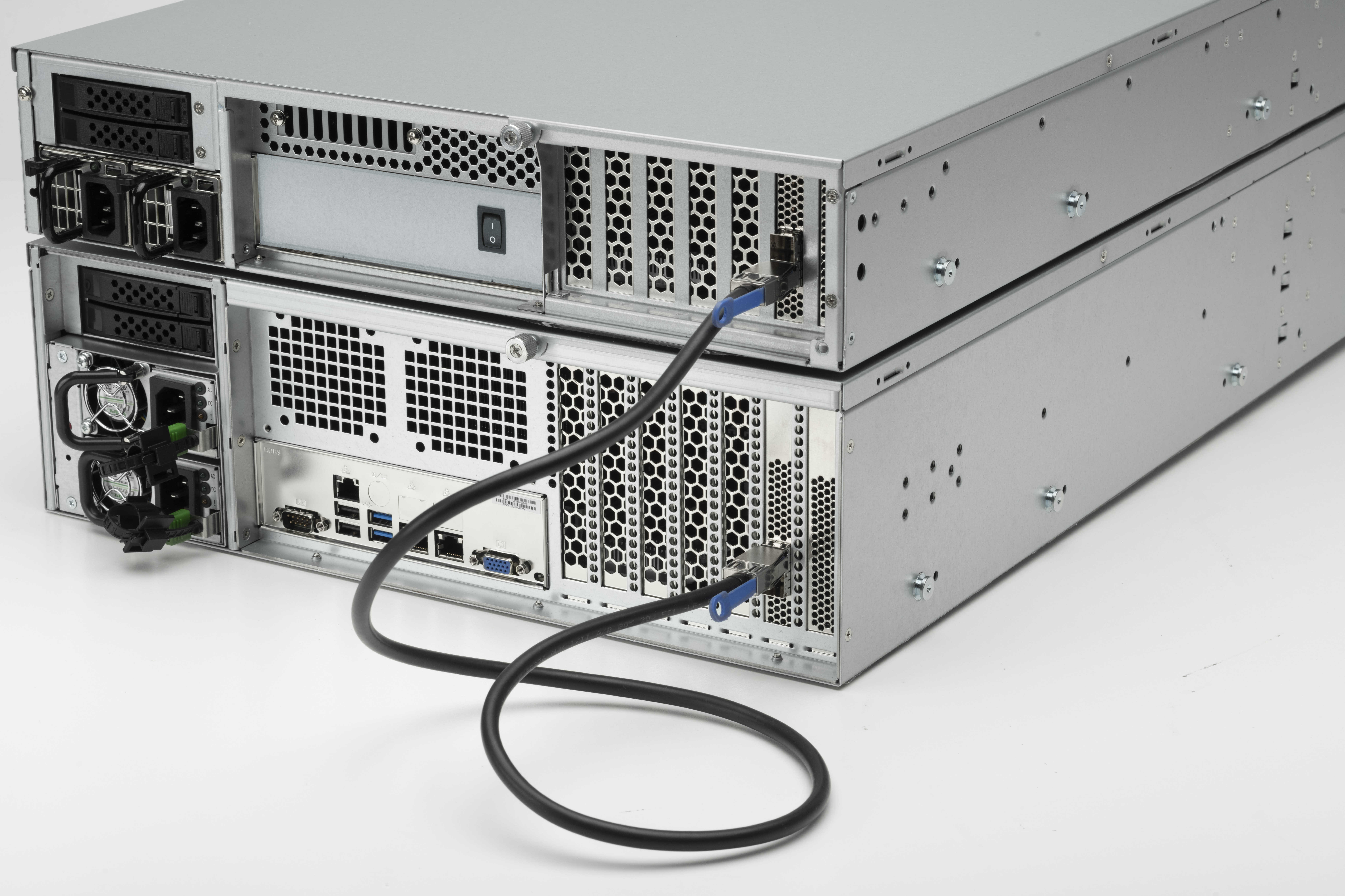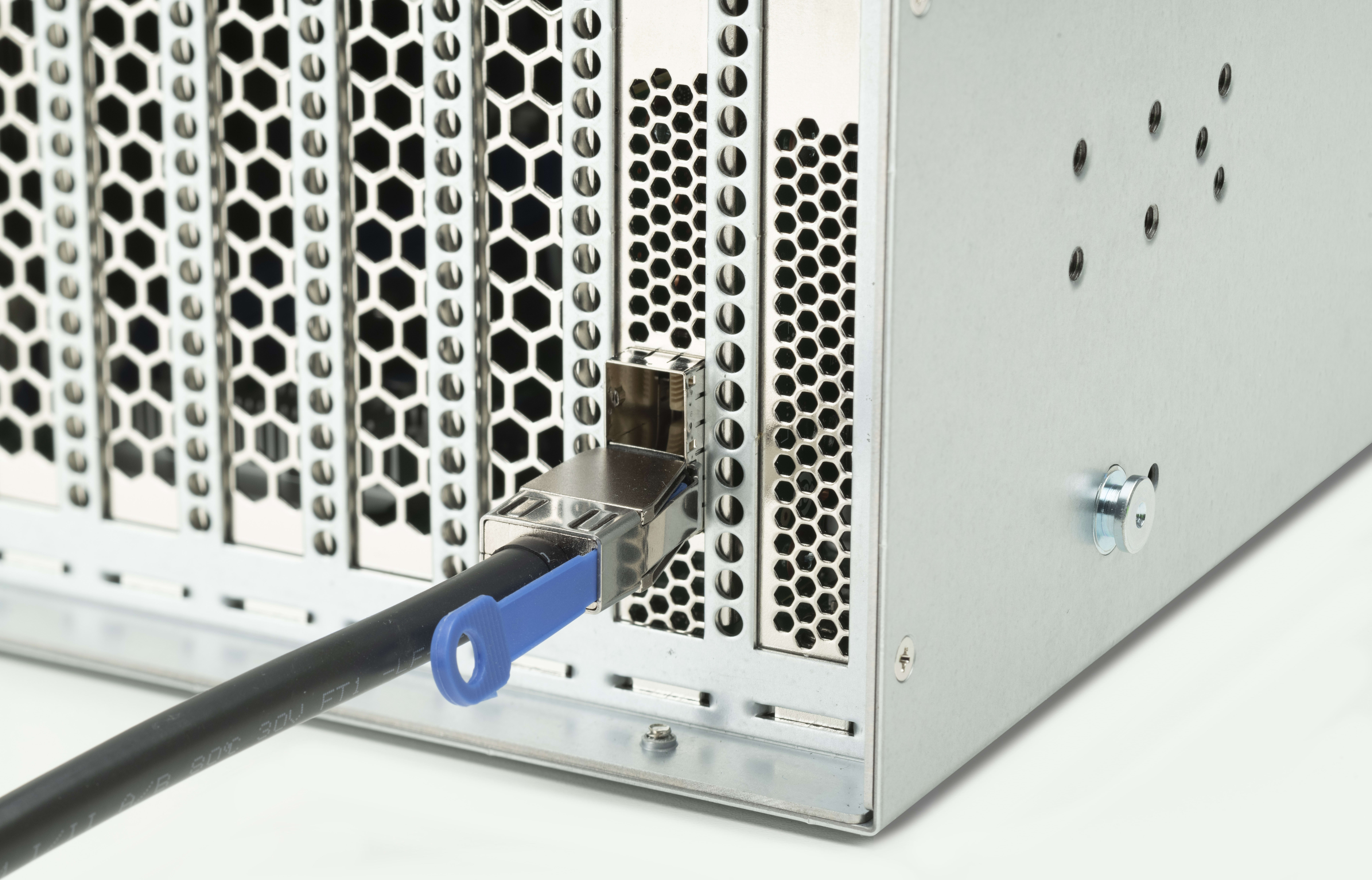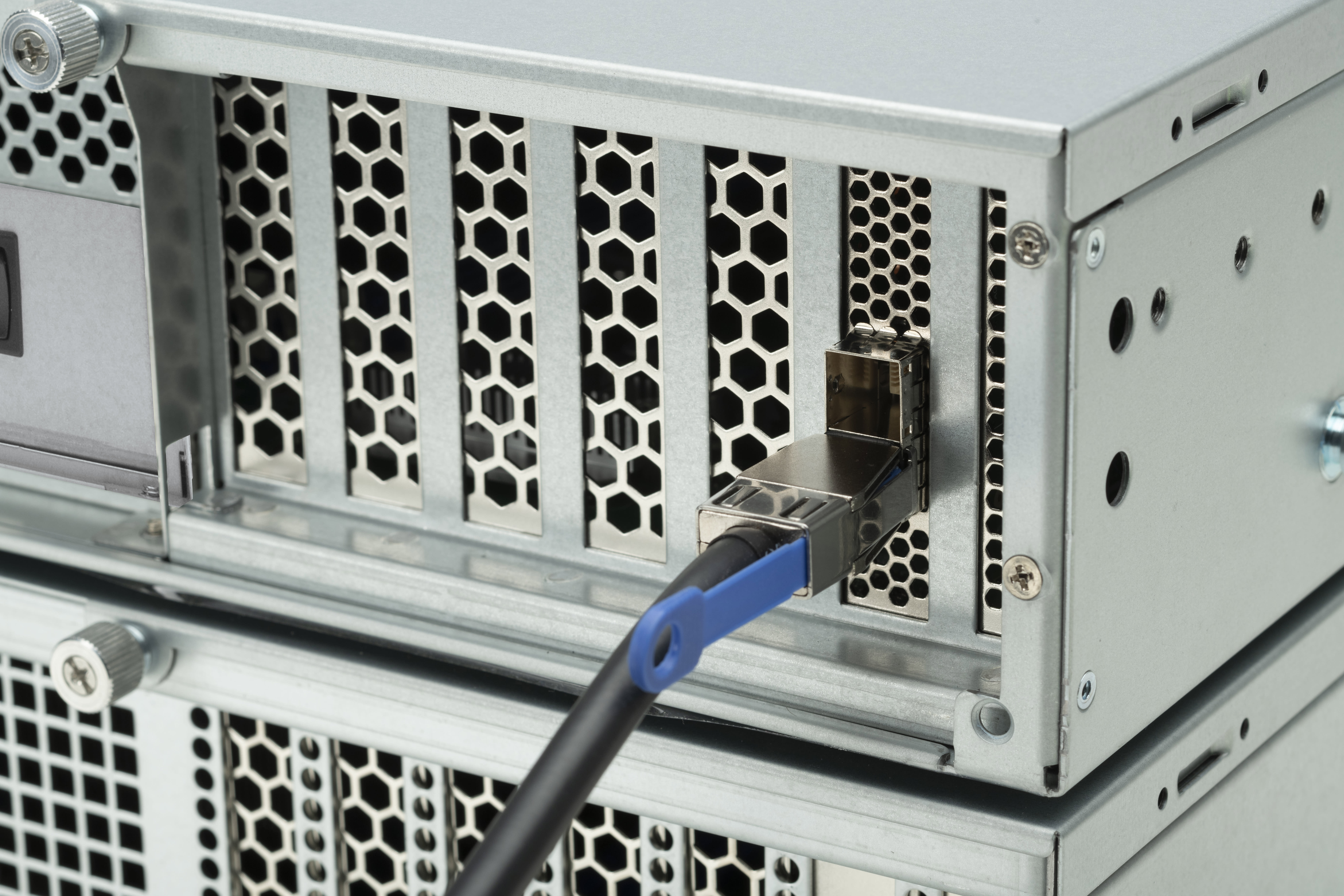 2. Connect a Mini SAS HD SFF 8644 cable into one of the Mini SAS HD SFF 8644 ports located on the back of the OWC Jupiter Kore. Ensure the blue tab on the cable is positioned to the right.