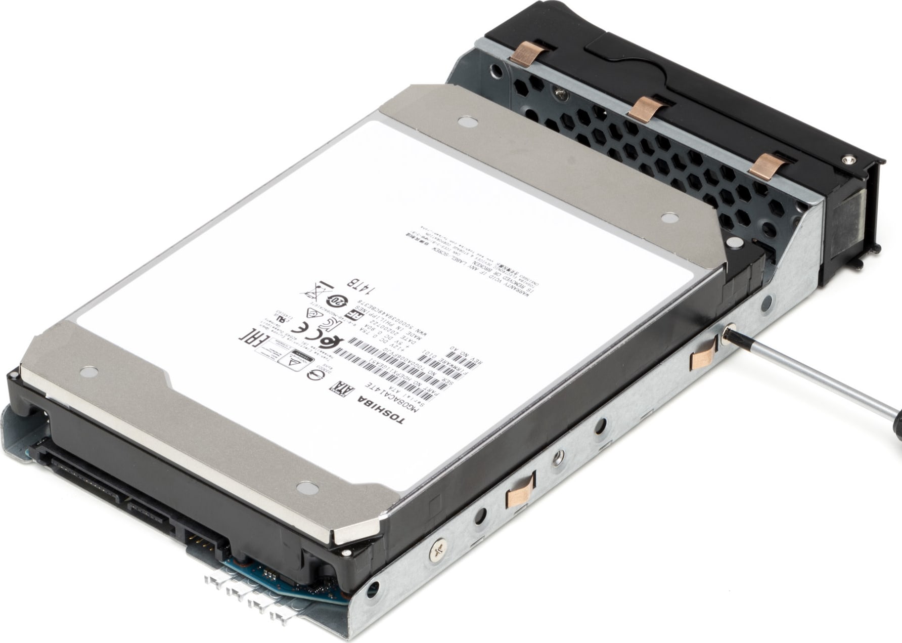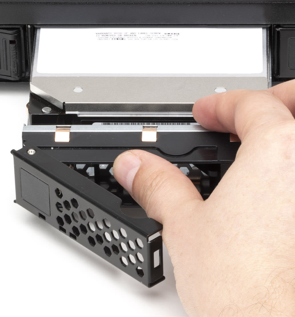 3. Remove the drive and place a new drive into the drive tray with the label facing upwards. Secure the drive to the drive tray.