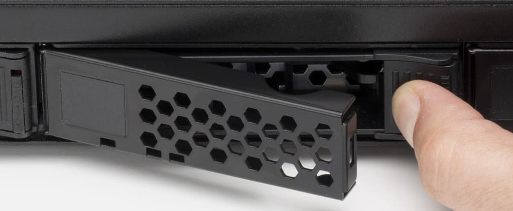 2. Each drive tray is labeled with a number. Additionally the drive trays have locking mechanisms. Press down on the locking mechanism to lock the drive tray. A small amount of red will show indicating the drive tray is locked. Press up to unlock the drive tray. The small amount of red will no longer appear indicating the drive tray is unlocked.