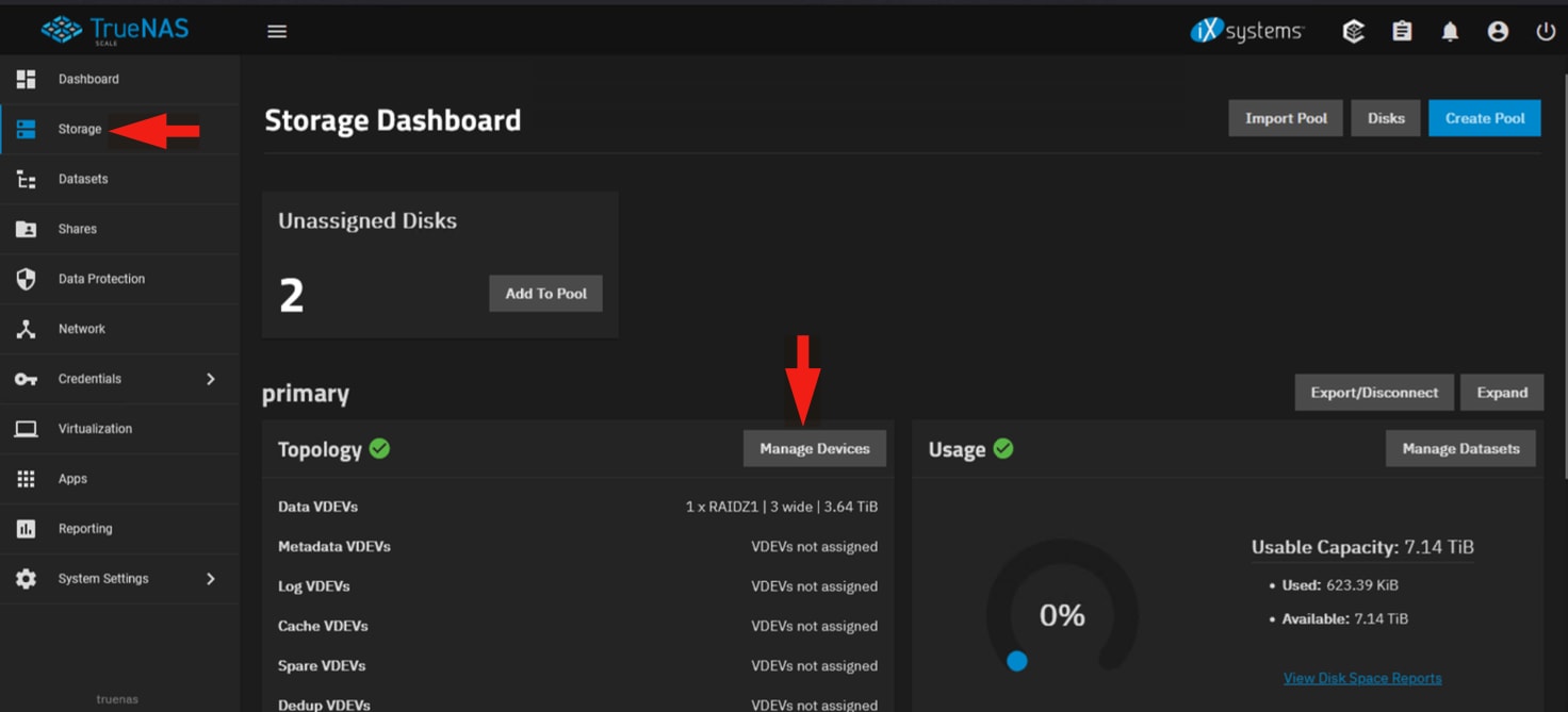 2. Access the TrueNAS SCALE web interface. Navigate to Storage and select Manage Devices.